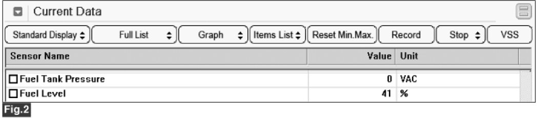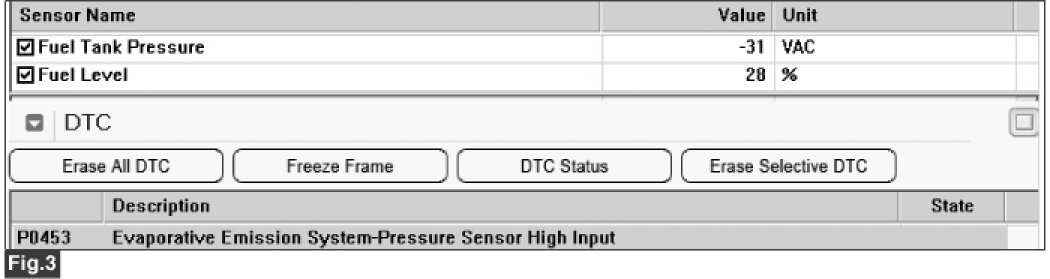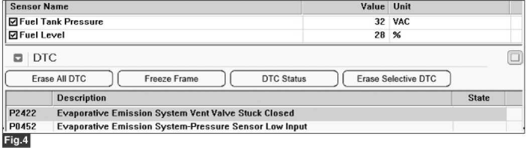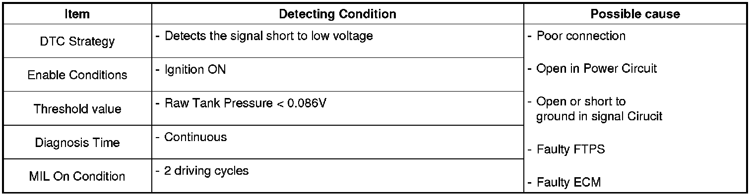 Checking output signals of fuel tank pressure sensor under detecting condition, if the tank pressure is lower than threshold, ECM sets P0452. MIL (Malfunction Indication Lamp) turns on when the malfunction lasts till consecutive 2 driving cycle.