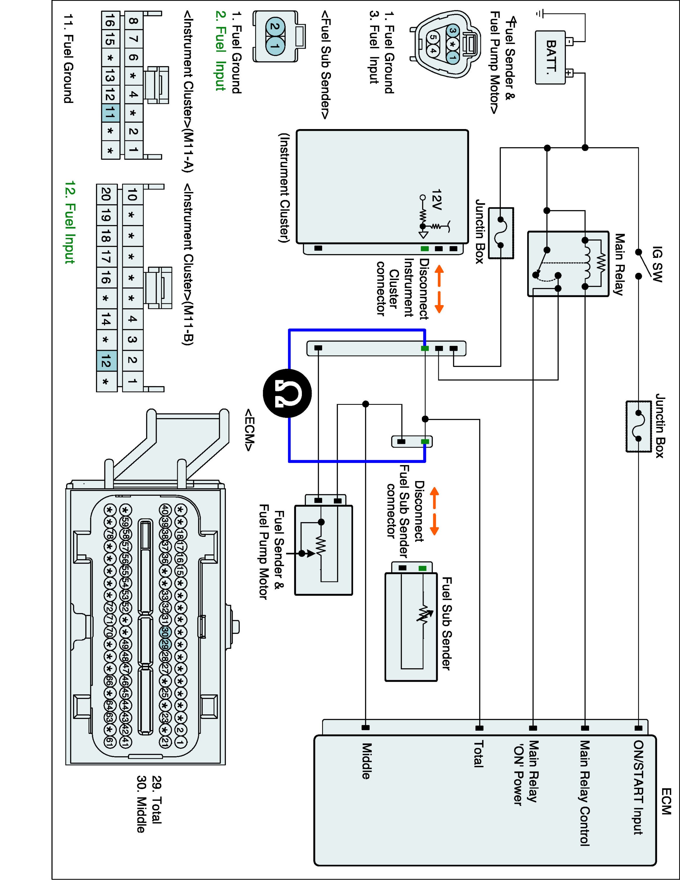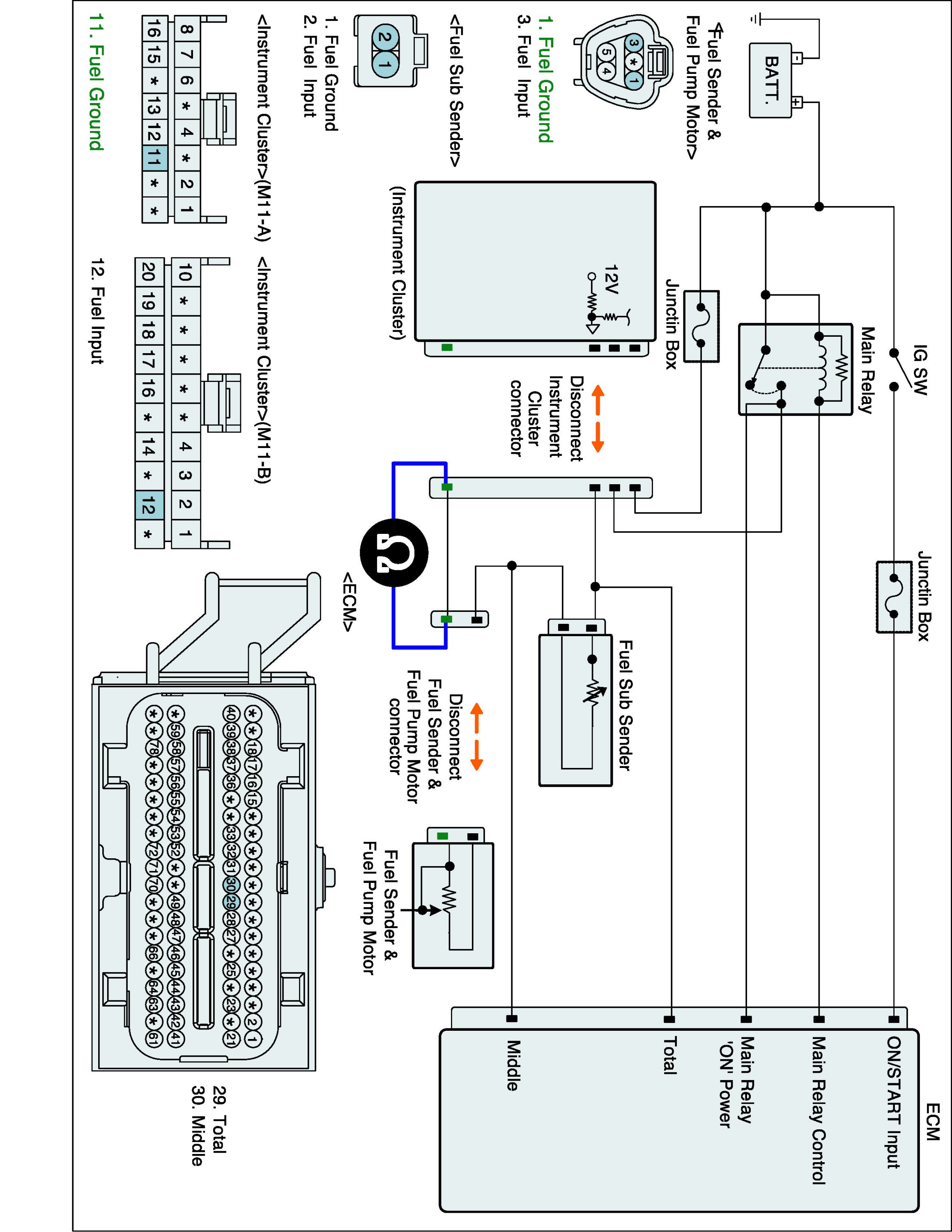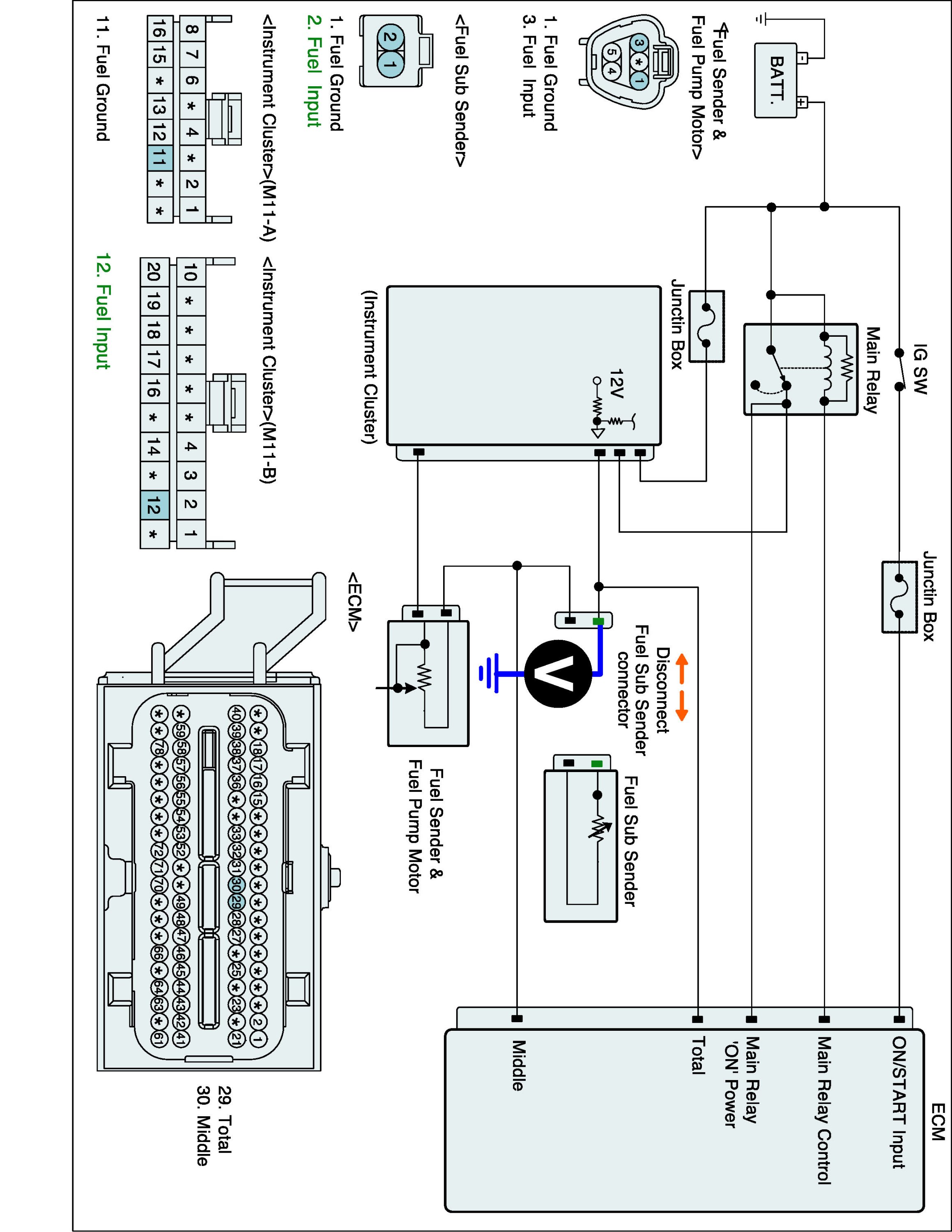 1. IG "OFF" and disconnect Fuel Sub Sender connector and ECM connector.