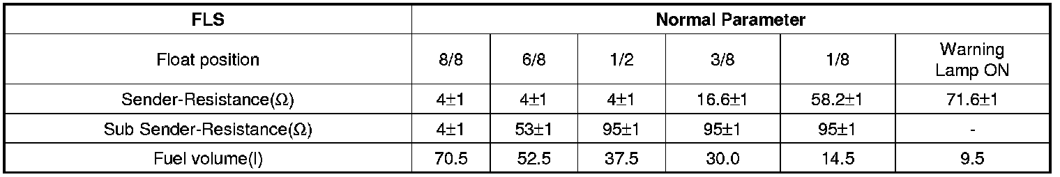 The Fuel Level Sensor (FLS) measures the fuel level in fuel tank and its information is used to supply the ECM with information regarding the monitoring condition of the EVAP canister purge system for leak detection. If the fuel level sensor is monitored for high or low stuck or difference between voltage of fuel level sensor and voltage deviation of fuel level sensor is exceeds limited value while driving, this is interpreted by the ECM as a fault