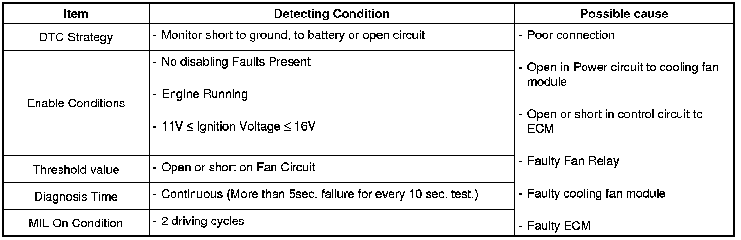 Checking power supply to cooling fan relay, cooling fan module and control signals under detecting condition, if the PCM detects short to ground, to battery or open circuit, ECM sets P0480. MIL (Malfunction Indicating Lamp) turns on when the malfunction lasts till consecutive 2 driving cycle.