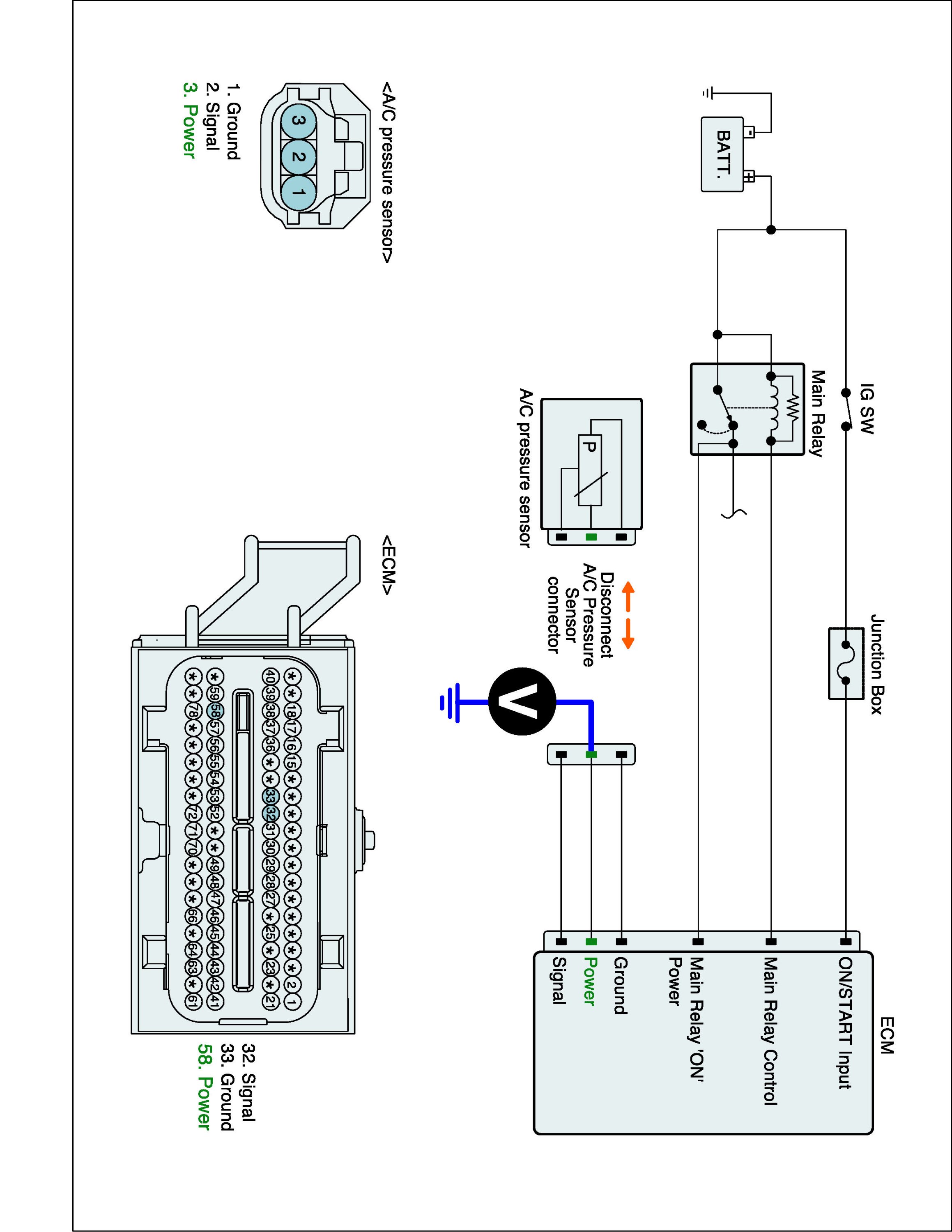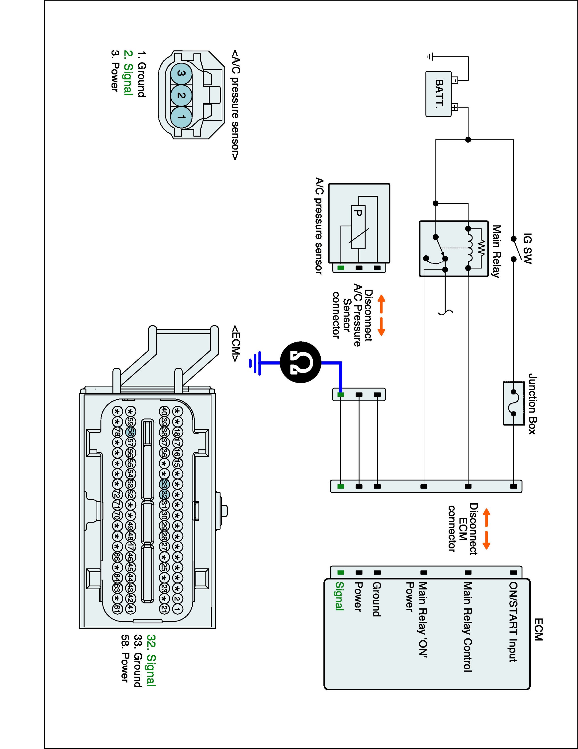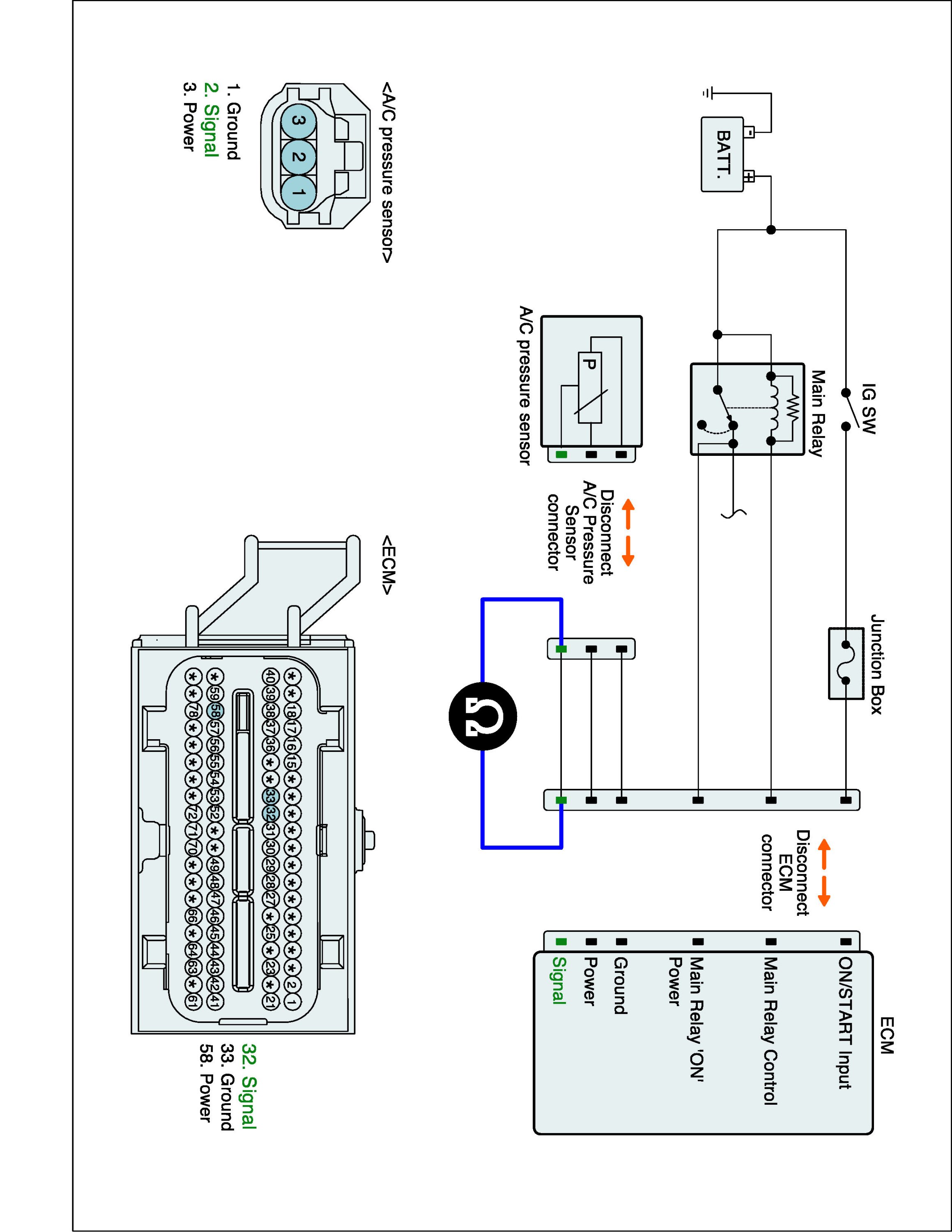1. IG "OFF" and disconnect A/C pressure sensor and ECM connector.