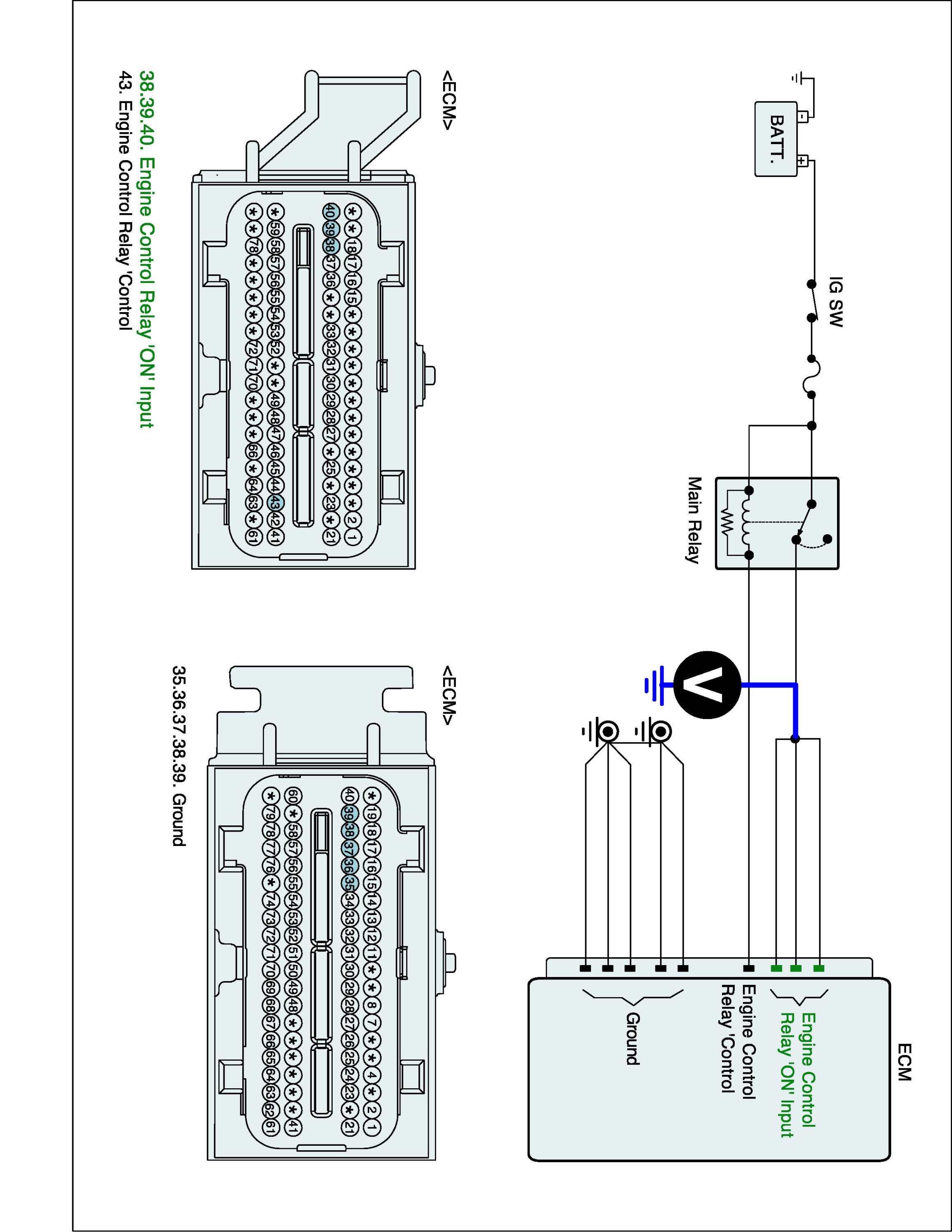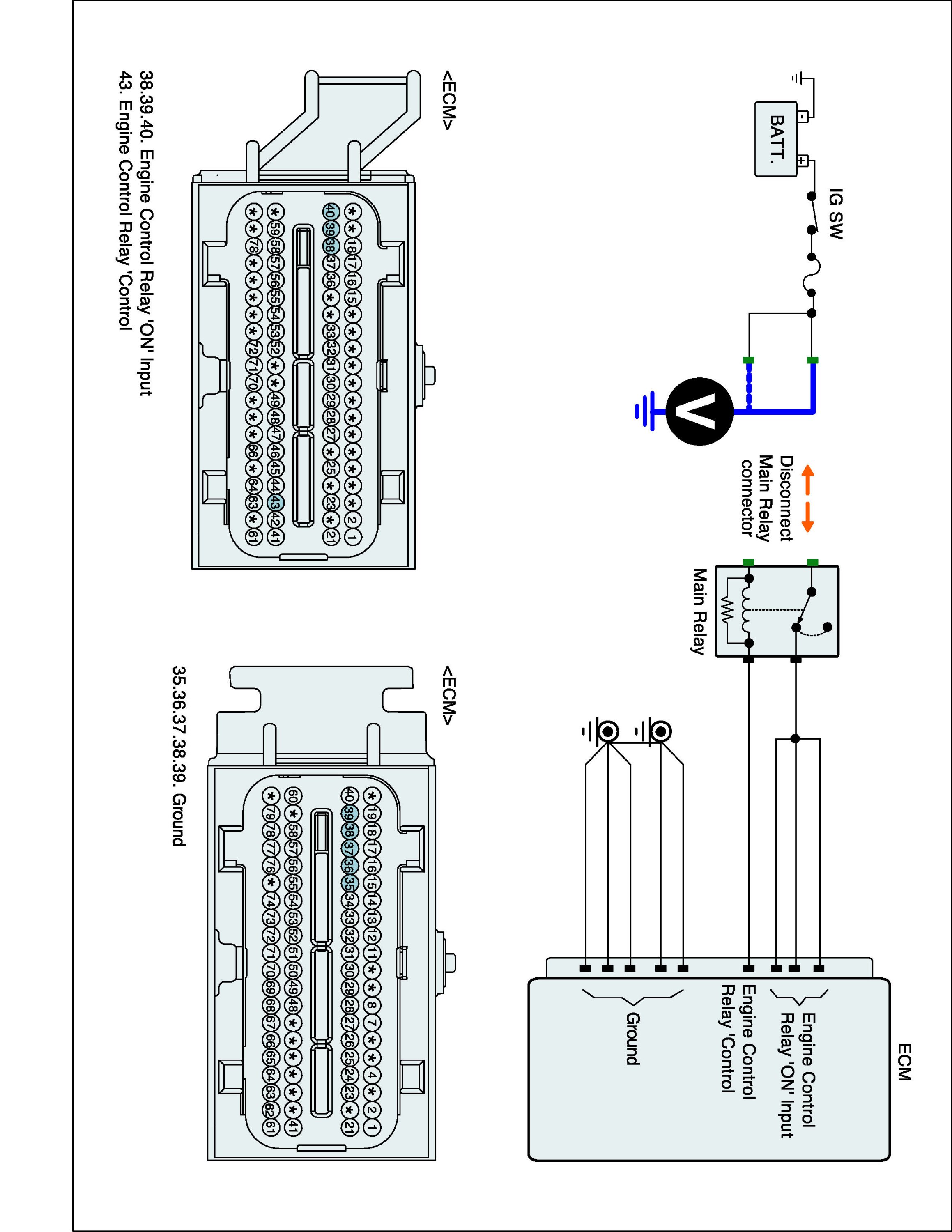 2. Measure the voltage between main relay 'ON' power terminals of ECM harness terminal and chassis ground.