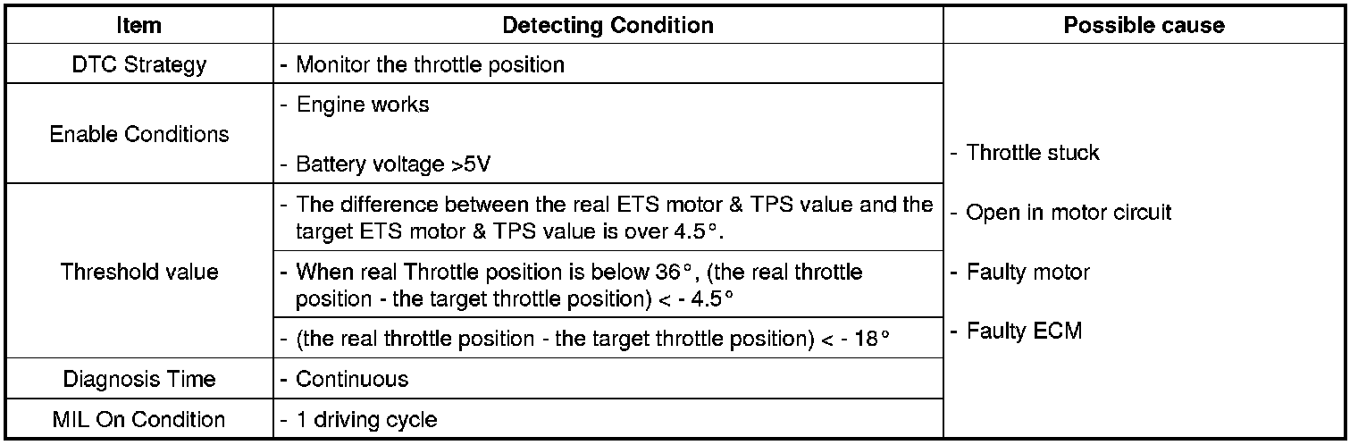 Checking output signals from TPS under detecting condition, if the difference between real and target throttle position is above the specified value, ECM sets P0638 and then MIL (Malfunction Indication Lamp) turns on.