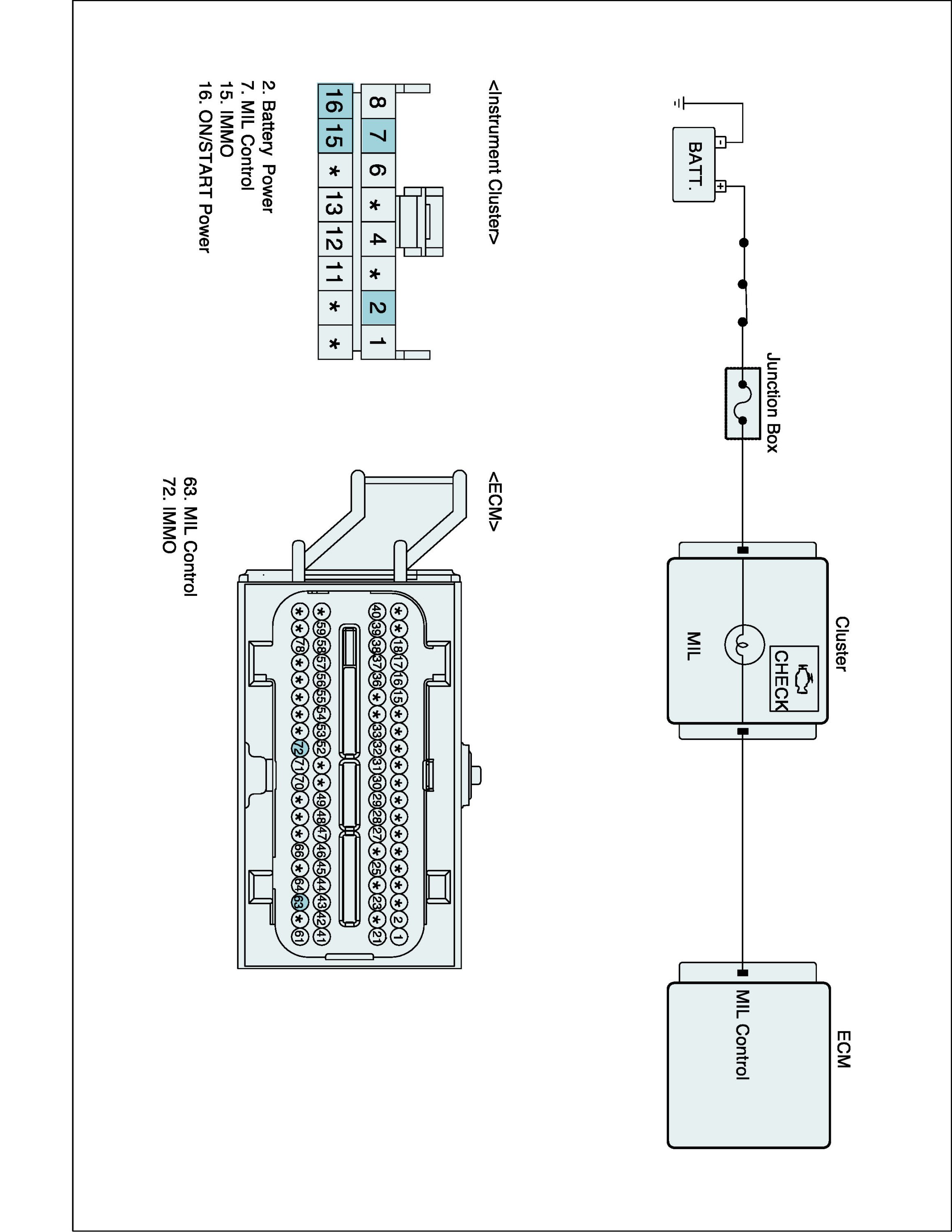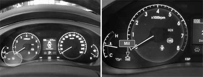 The Malfunction Indicator Lamp (MIL), which is located in the instrument cluster, comes on to notify the driver that there may be a problem with the vehicle and that service is needed. Immediately after the ignition switch turns on, the malfunction indicator lamp is lit to indicate that the MIL operates normally and goes off after starting