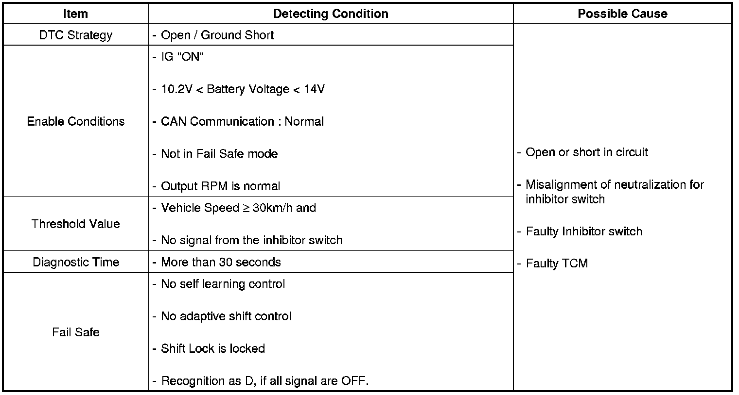 If TCM has not received any signal from inhibitor switch for 30 seconds, TCM sets DTC. While TCM proceeds final confirm for this fault in its internal process, Shift Lock functions to prevent shifting to Reverse for safety.