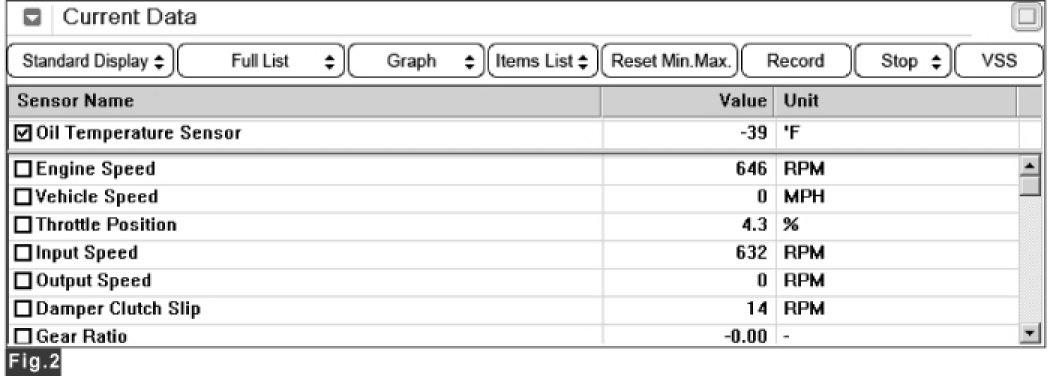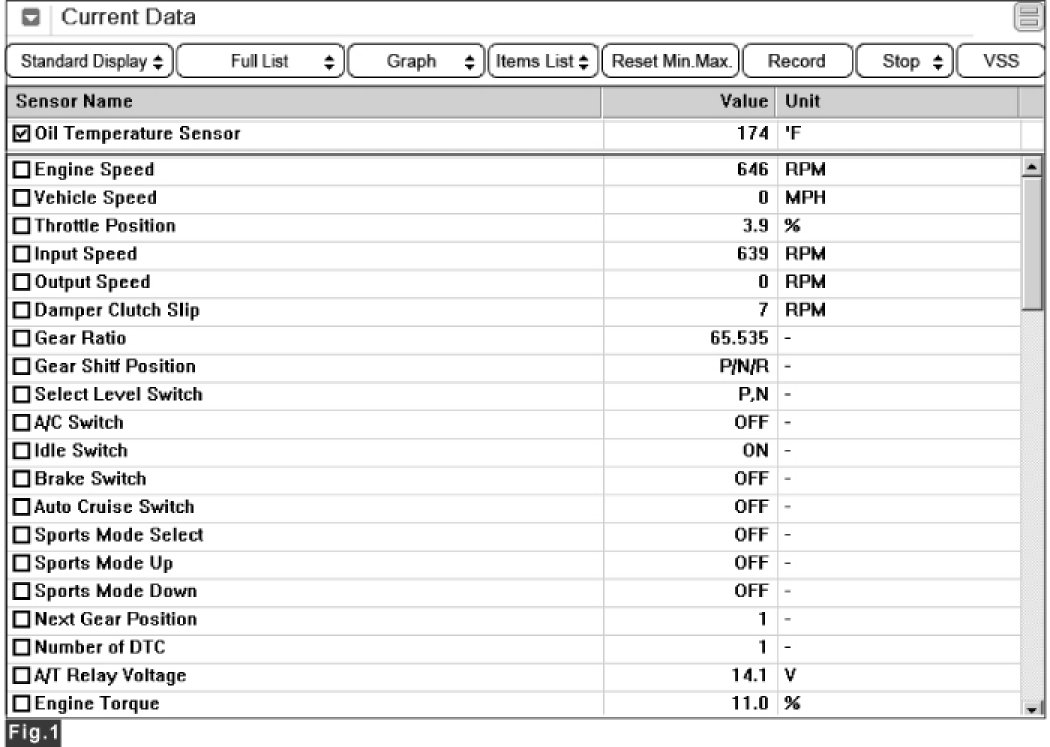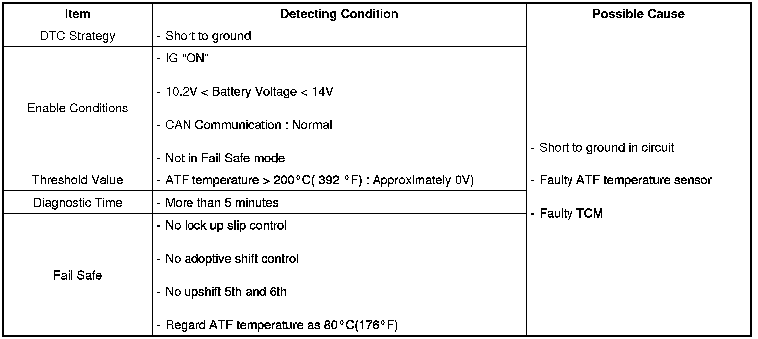 TCM sets DTC when the ATF temperature sensor signal has been detected over 200 °C, voltage is approximately 0V, for 5 minutes. The TCM regards the ATF temperature as fixed at a value of 80 °C (176 °F) when ATF temperature sensor is faulty.