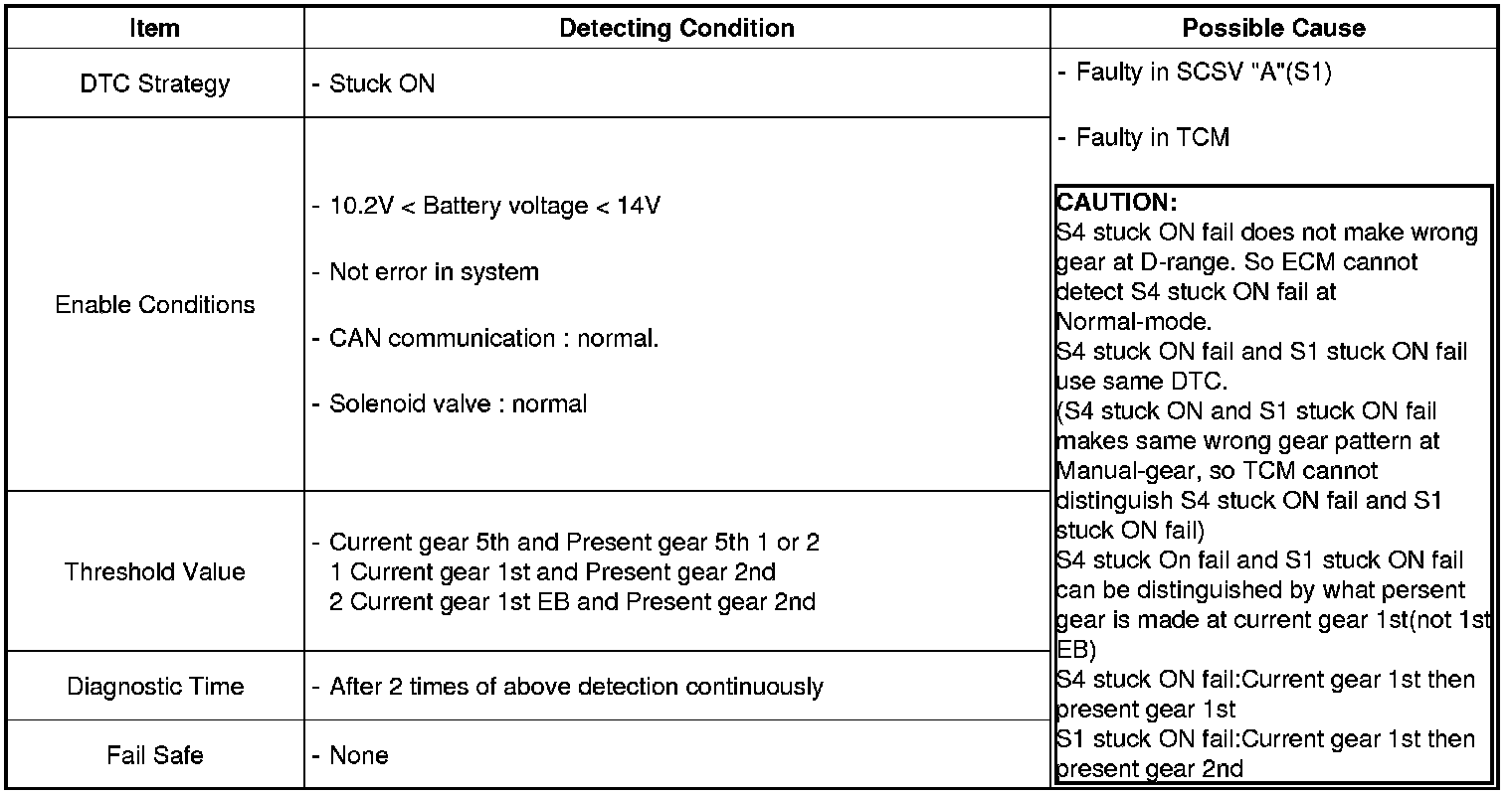 4 shift solenoid valves are installed directly in valve-body. The solenoids operates of ON and OFF by the control signal from TCU. Combinations of 4 solenoids, S1, S2, S3 and S4, changes gear ranges (1st to 6th)