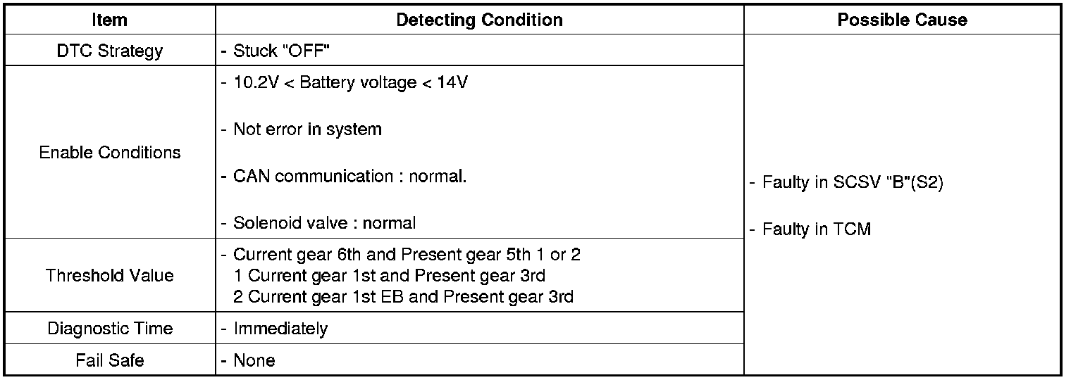TCM set this code If the rear gear ratio that calculated by Engine speed/Output speed and the target gear ratio that calculated by compounding of solenoid valves are not match.