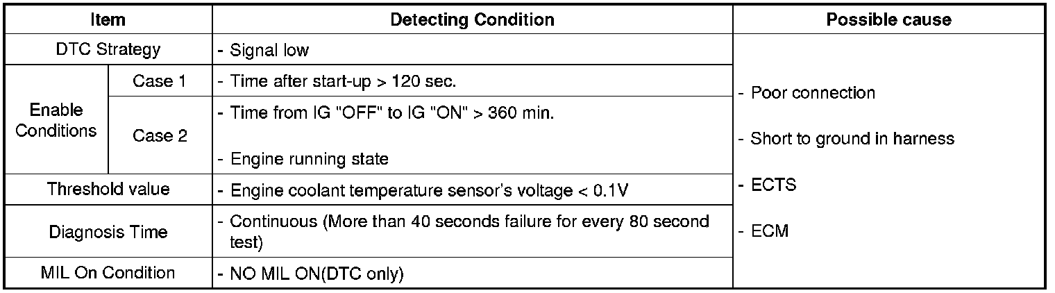 The Engine Coolant Temperature Sensor (ECTS) is located in the engine coolant passage of the cylinder head for detecting the engine coolant temperature. The ECTS uses a thermistor whose resistance changes with the temperature. The electrical resistance of the ECTS decreases as the temperature increases, and increases as the temperature decreases. The reference 5V in the ECM is supplied to the ECTS via a resistor in the ECM. That is, the resistor in the ECM and the thermistor in the ECTS are connected in series. When the resistance value of the thermistor in the ECTS changes according to the engine coolant temperature, the output voltage also changes. During cold engine operation the ECM increases the fuel injection duration and controls the ignition timing using the information of engine coolant temperature to avoid engine stalling and improve drivability.