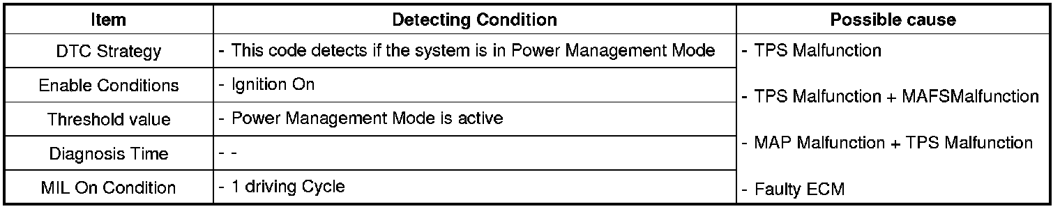 If power management mode is recognized under detecting condition, ECM sets P1295. And MIL (Malfunction Indication Lamp) turns on.