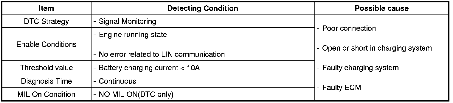 ECM sets this code when the battery charging current from battery sensor is too low.