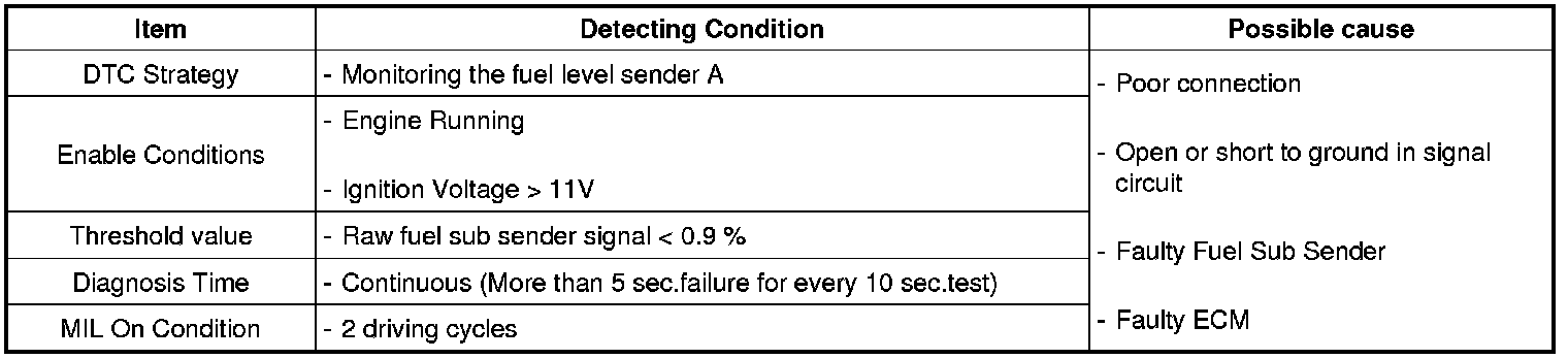 The Fuel Level Sensor (FLS) measures the fuel level in fuel tank and its information is used to supply the ECM with information regarding the monitoring condition of the EVAP canister purge system for leak detection. If the fuel level sensor is monitored for high or low stuck or difference between voltage of fuel level sensor and voltage deviation of fuel level sensor is exceeds limited value while driving, this is interpreted by the ECM as a fault