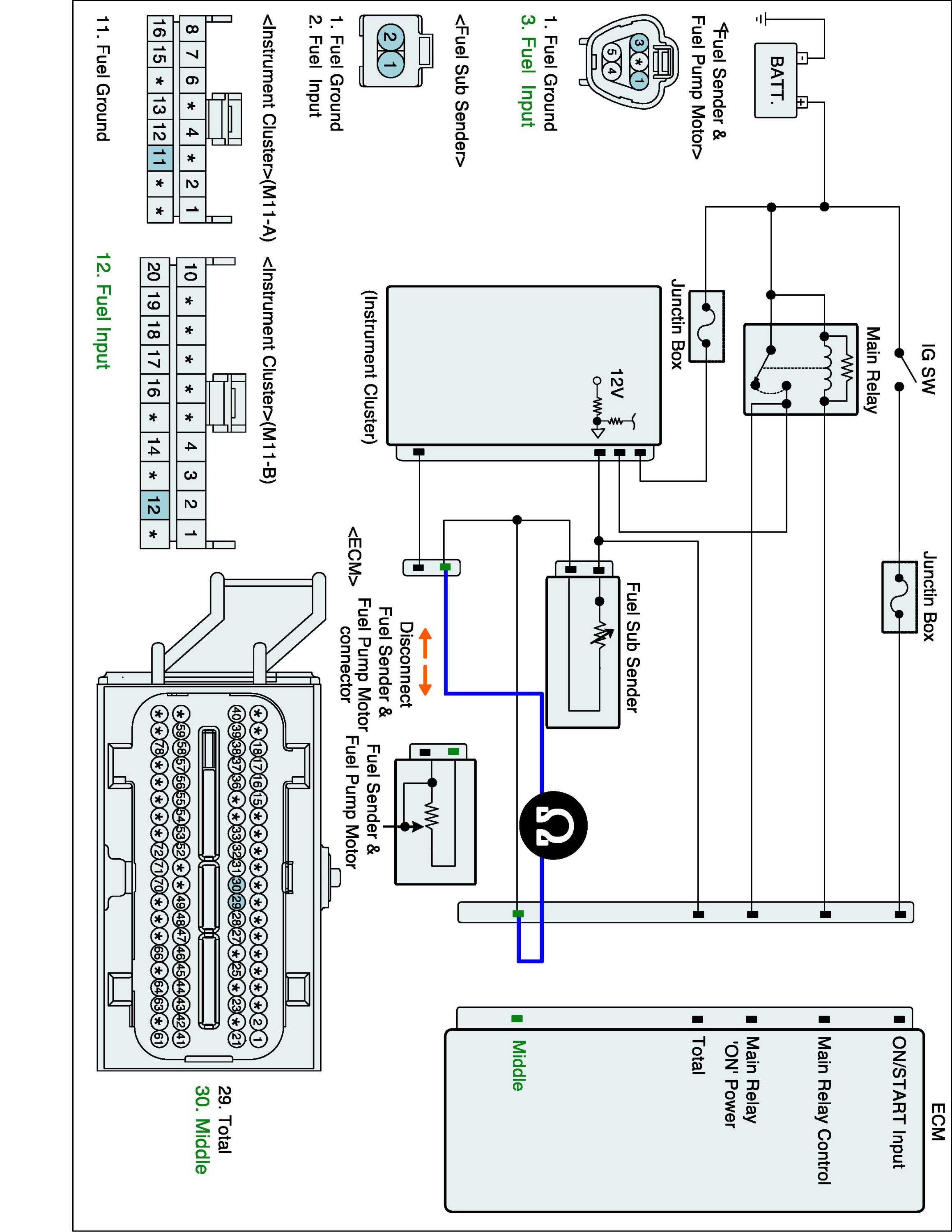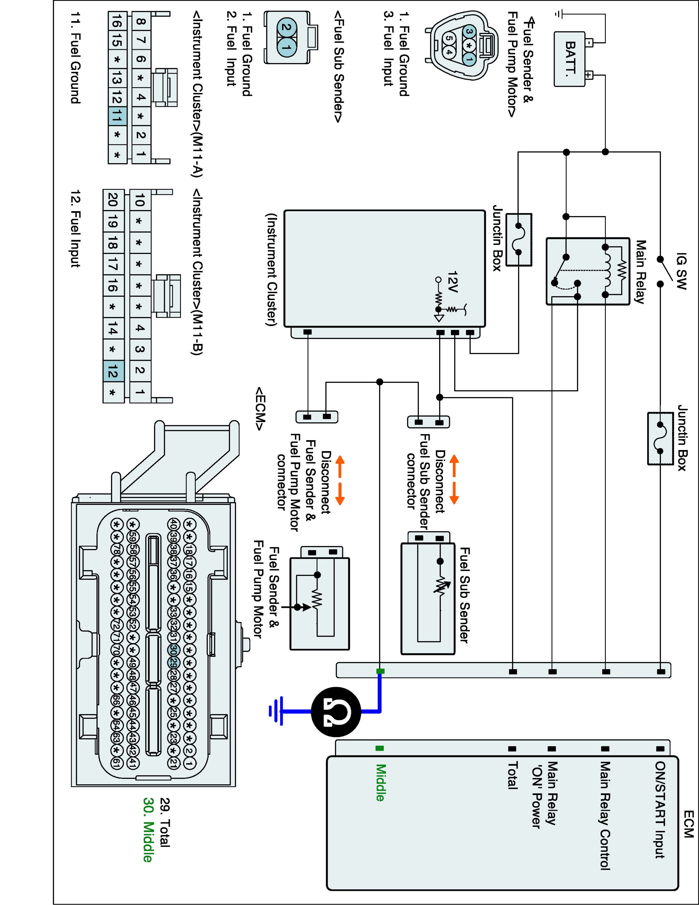 1. IG "OFF" and disconnect Fuel Sender A & Fuel Pump Motor connector, Fuel Sub Sender B connector and ECM connector.