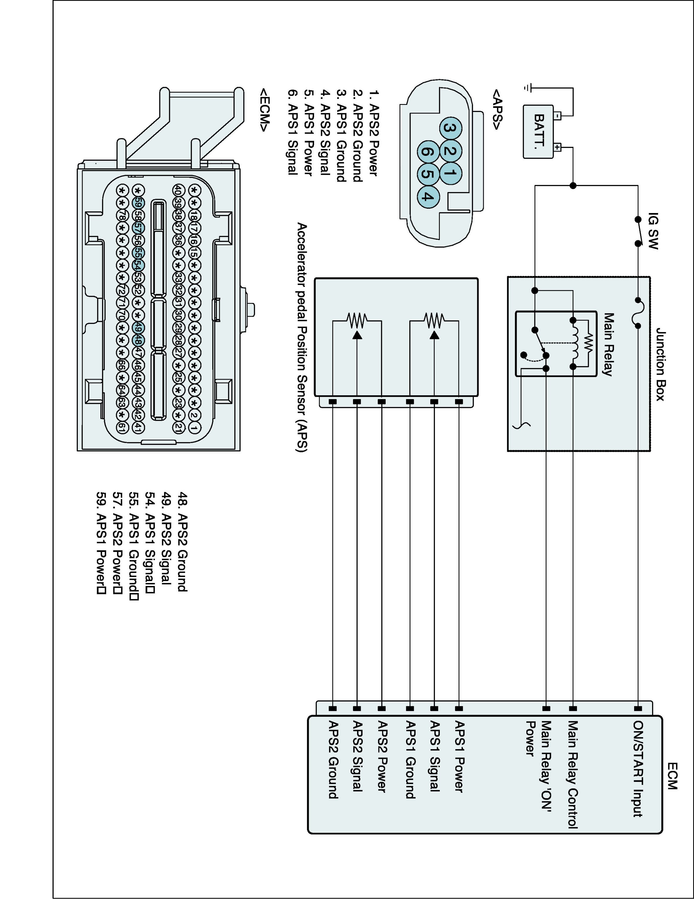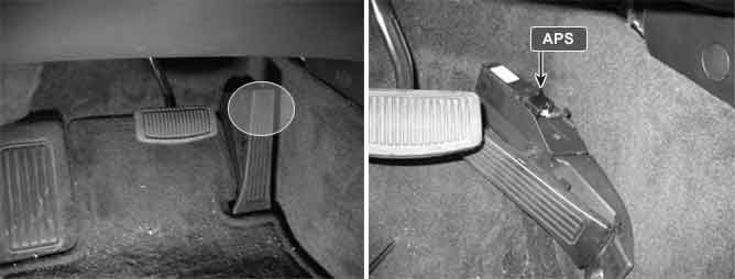 The Electronic Throttle Control (ETC) system is made of the components throttle body, Throttle Position Sensor (TPS) 1 & 2 and Accelerator Position Sensor (APS) 1 & 2. The APS is mounted in the accelerator pedal to detect the opening angle of the accelerator pedal. It has 2 sensors to detect the accelerator position and a malfunction of the accelerator position sensor. The ECM judges the current opening angle of the accelerator pedal from APS1 & 2, and the ECM controls the throttle motor based on these signals.