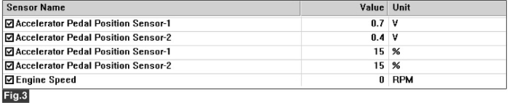Checking output signals from APS 1 under detecting condition, if output signals are above the threshold, ECM sets P2123. And then MIL (Malfunction Indication Lamp) turns on.