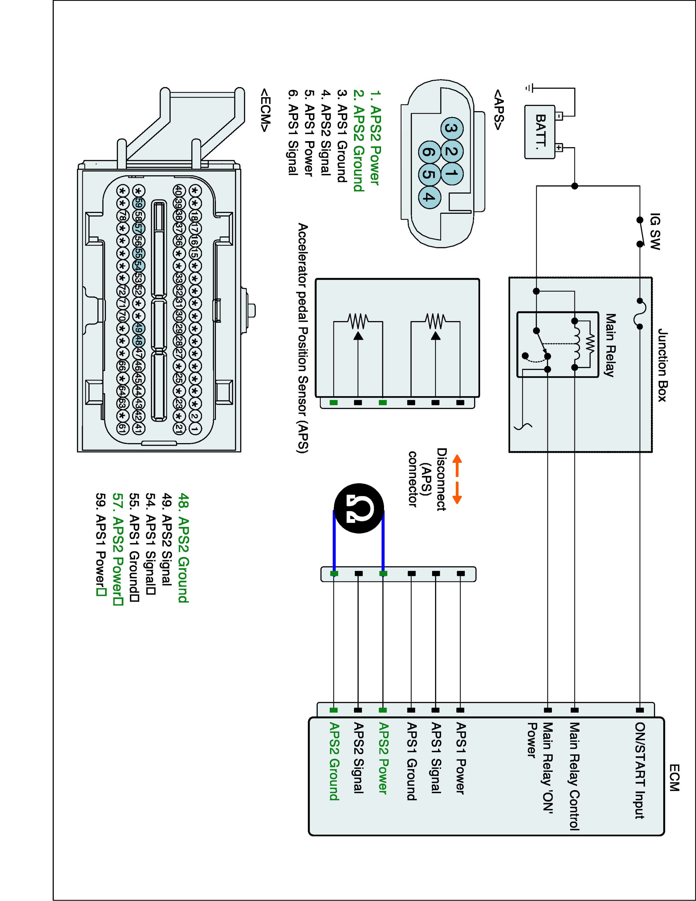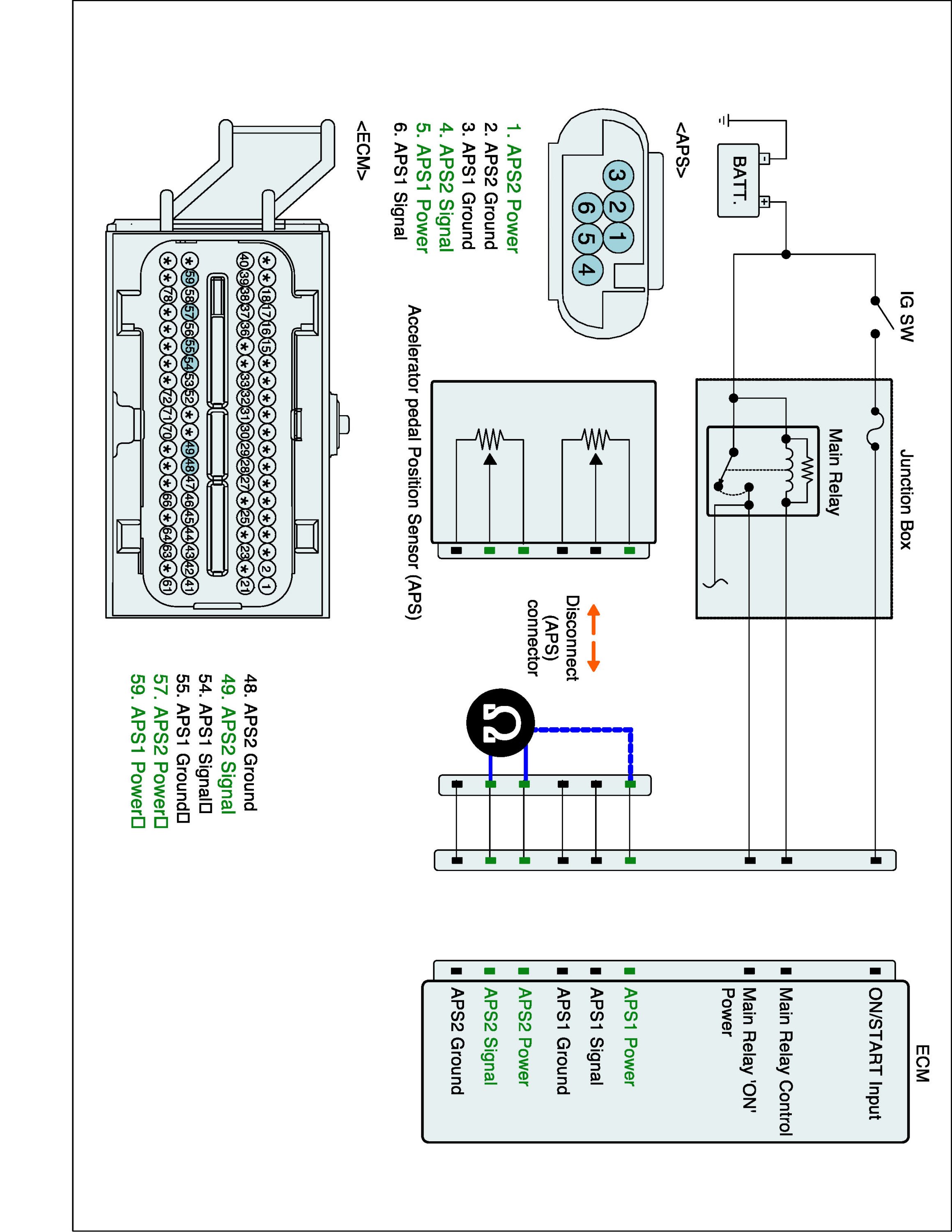 2. Measure resistance between APS2 signal and APS1 power terminals of APS harness connector.