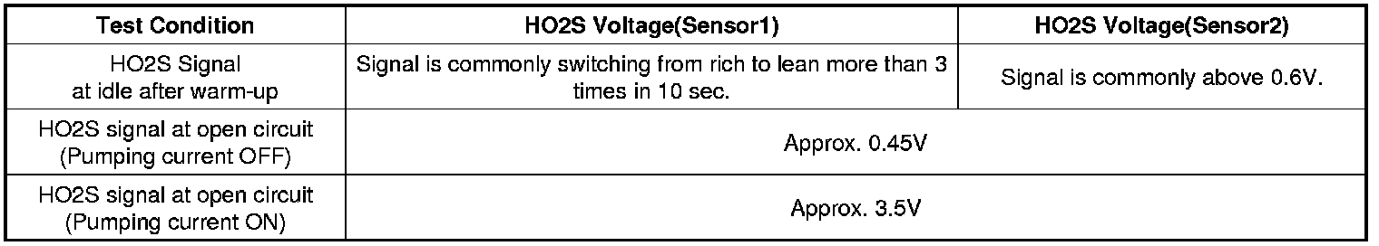 After warming-up, if accelerator pedal is released suddenly around 4000 rpm, the HO2S signal reading will be lower than 200 mV resulting from Fuel cut-off for the moment. Conversely, if suddenly accelerator pedal is depressed, HO2S signal reading will be around 0.6V ~ 1.0V. At idle, Normally HO2S signal will switch from lean to rich with 3 Hz. And as racing, Its frequency rises.