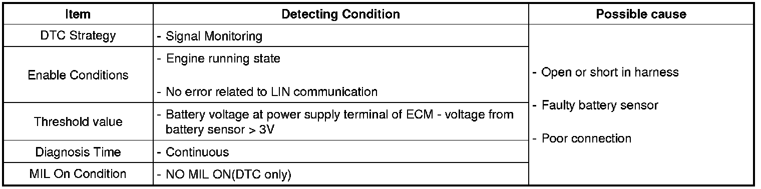 ECM sets this code when there is difference between battery voltage at power supply terminal of ECM and the voltage from battery senor.