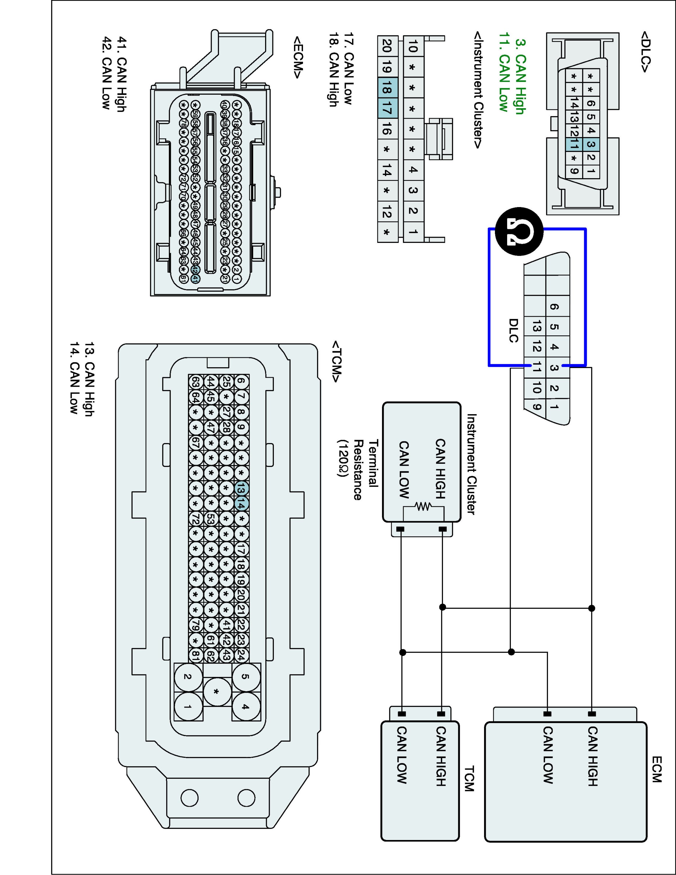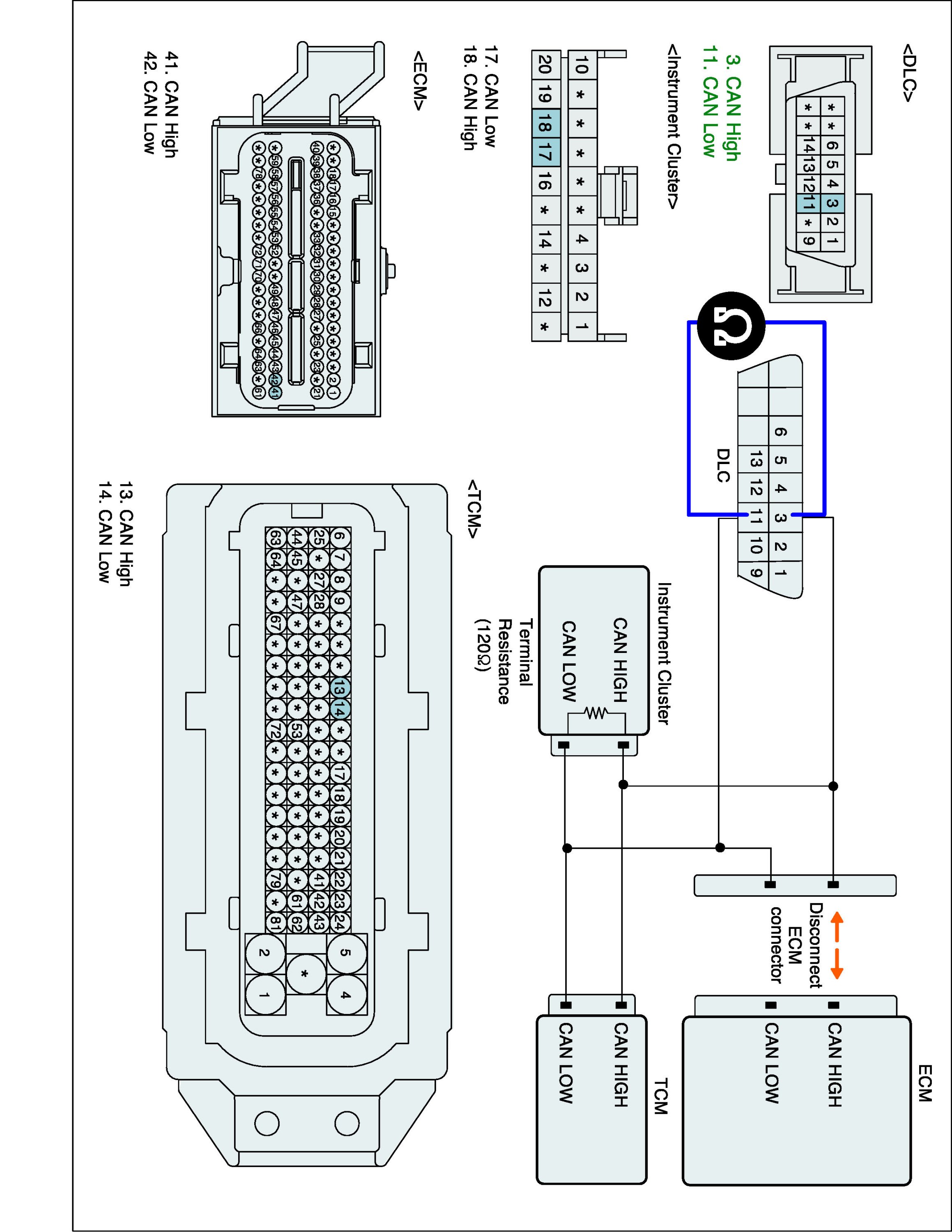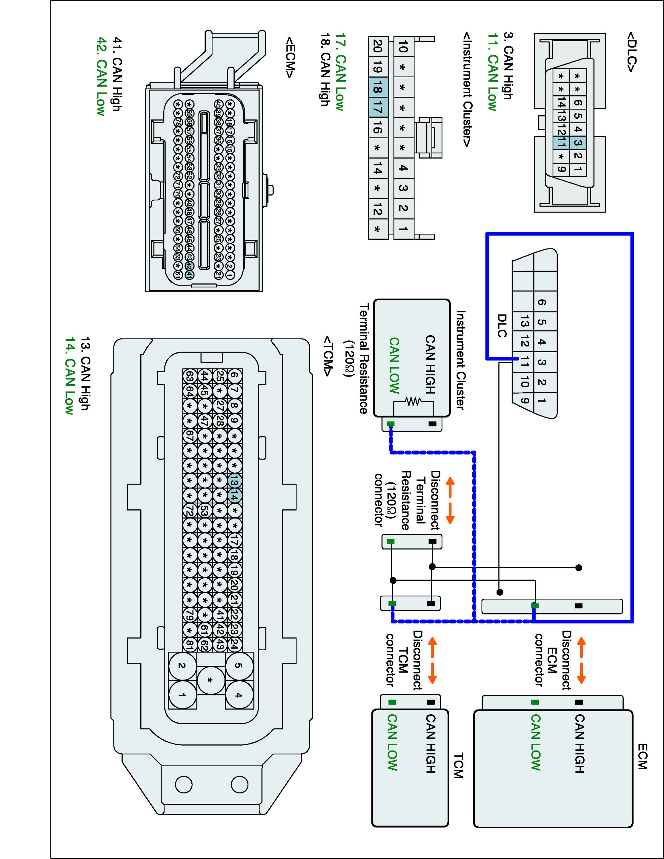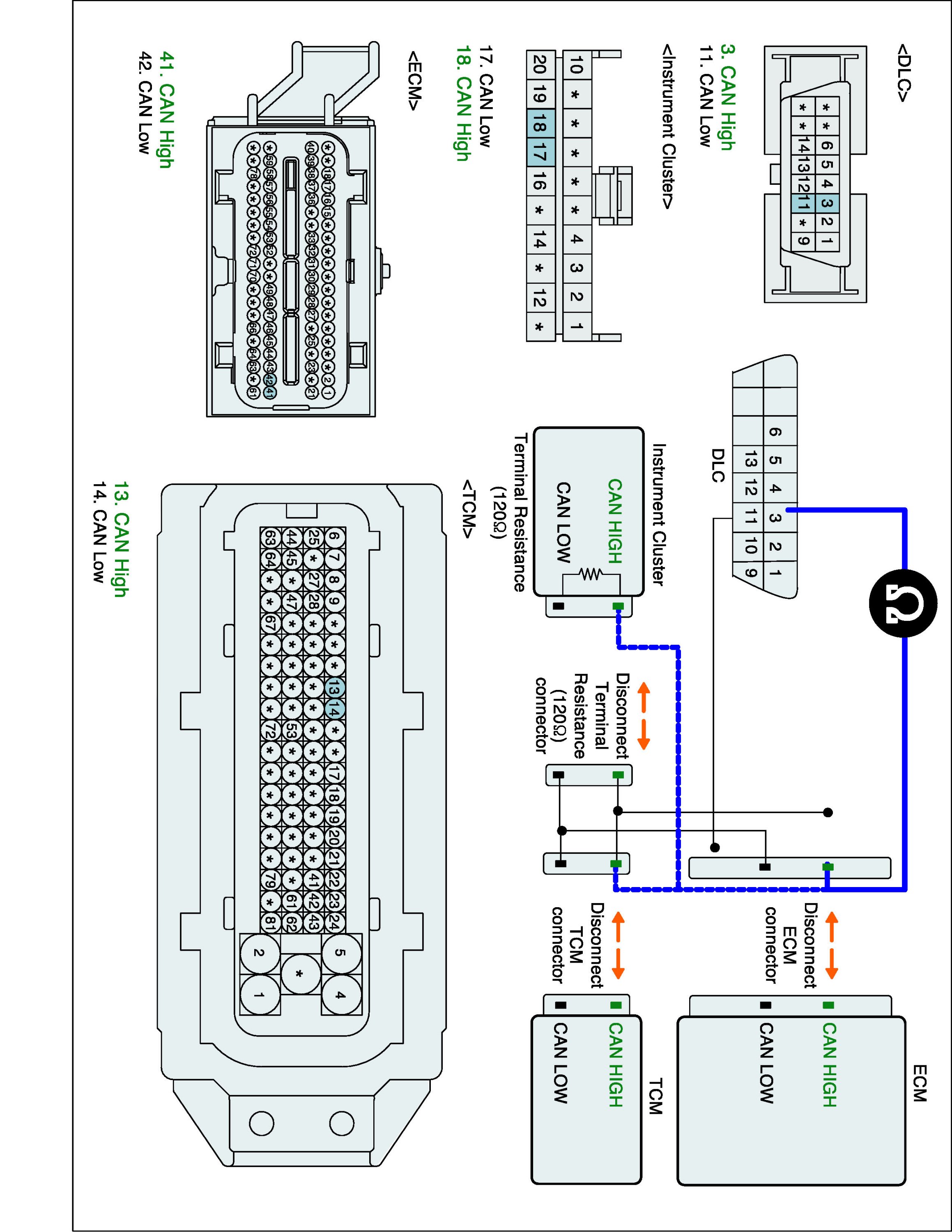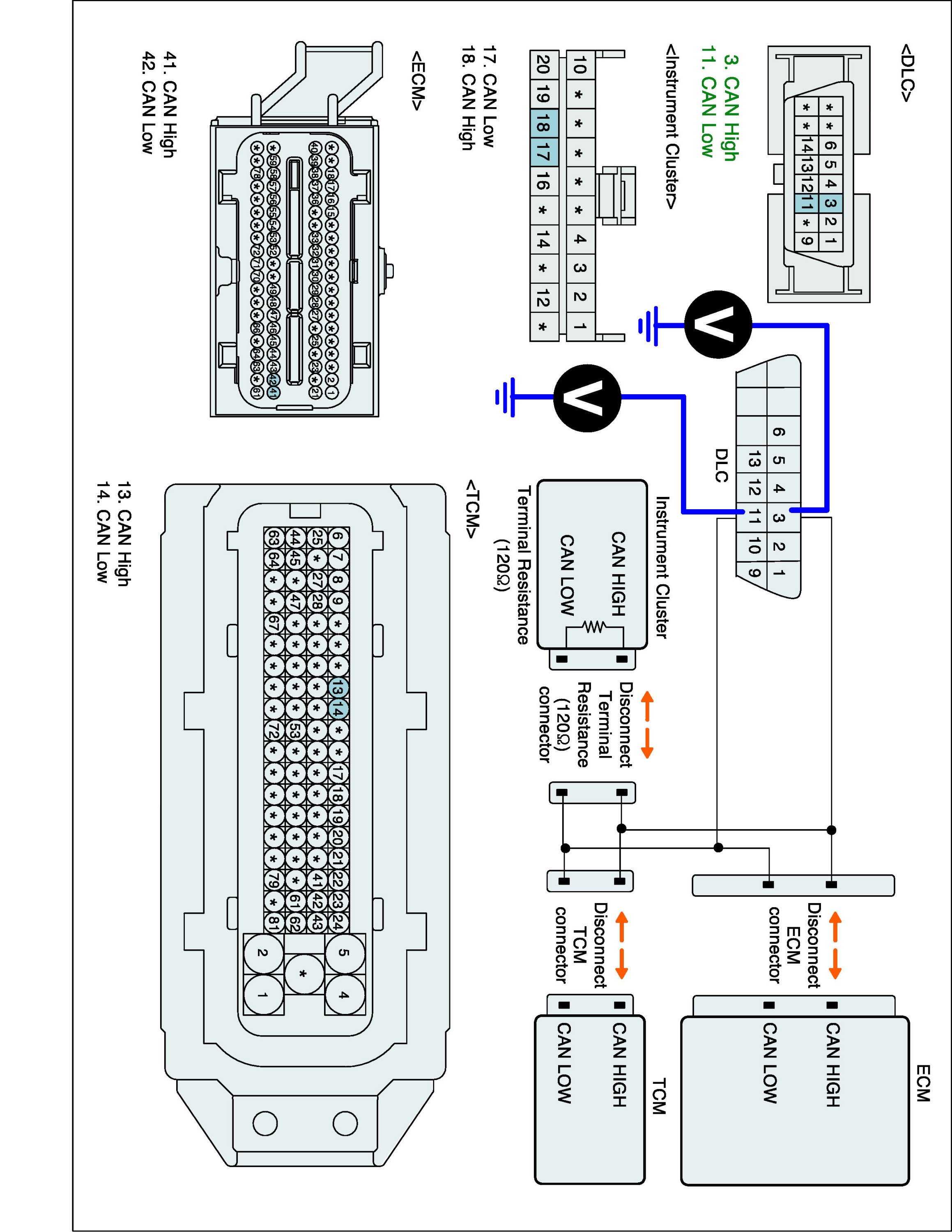 Specification : ECM, Instrument Cluster and ABS/ESC ECU connected : 60 ± 3 ohms (Measurement "A"), ECM disconnected : 120 ± 3 ohms (Measurement "B")