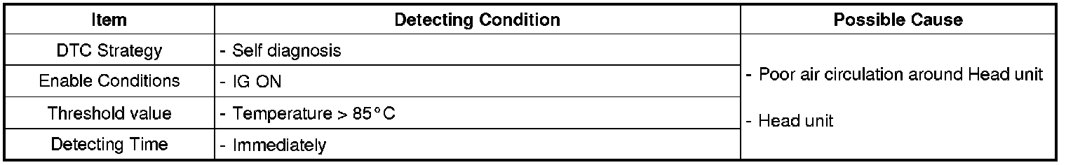 This code is set when a temperature sensor of Head unit detect that the temperature is over 85 °C, At that time Tuner & Amplifier can be abnormal status. If the temperature is around 85 °C, the fan is running to make the temperature down. After cooling, Tuner & Amplifier is normal status under 75 °C.
