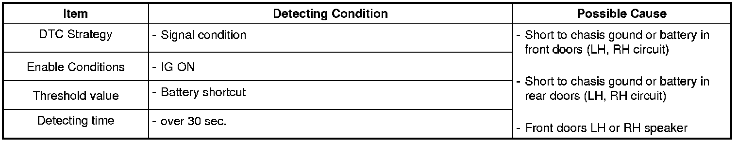 This code is set when circuit of LH & RH'middle/tweeter of front door or circuit of LH & RH'middle/tweeter of rear door short over 30 sec during ignition on.