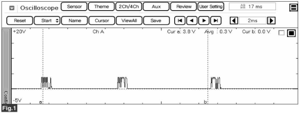 FIG. 2) Normal MM Low CAN signal waveform while one input signal is given at armrest control switch of rear seat (measured waveform signal at MM Low CAN line of head unit)
