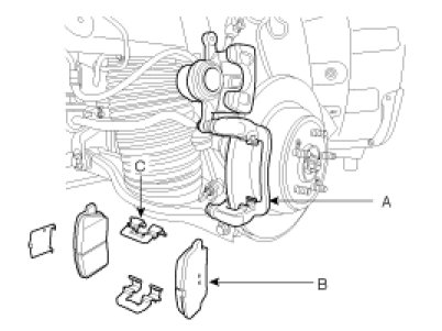2. Replace pad shim, pad retainers (C) and brake pads (B) in the caliper bracket (A).