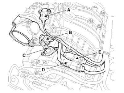(2) Disconnect the MAP sensor connector (A), ETC connector (B), RH exhaust OCV connector (C), RH injector connector (D) and RH ignition coil connector (E).