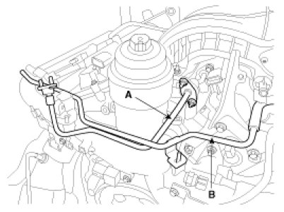 6. Install the fuel pipe (A) and vacuum pipe (B).