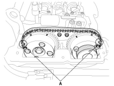 (13) Turn the crankshaft two turns in the operating direction (clockwise) and realign crankshaft sprocket and camshaft sprocket timing marks (A).