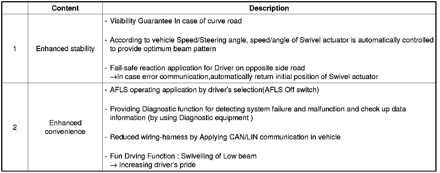 AFLS(Adaptive Front-lighting System)is a headlamp orientation control system that takes into account both steering angle and vehicle speed to orient the headlamps to an angle that provides better nighttime visibility.