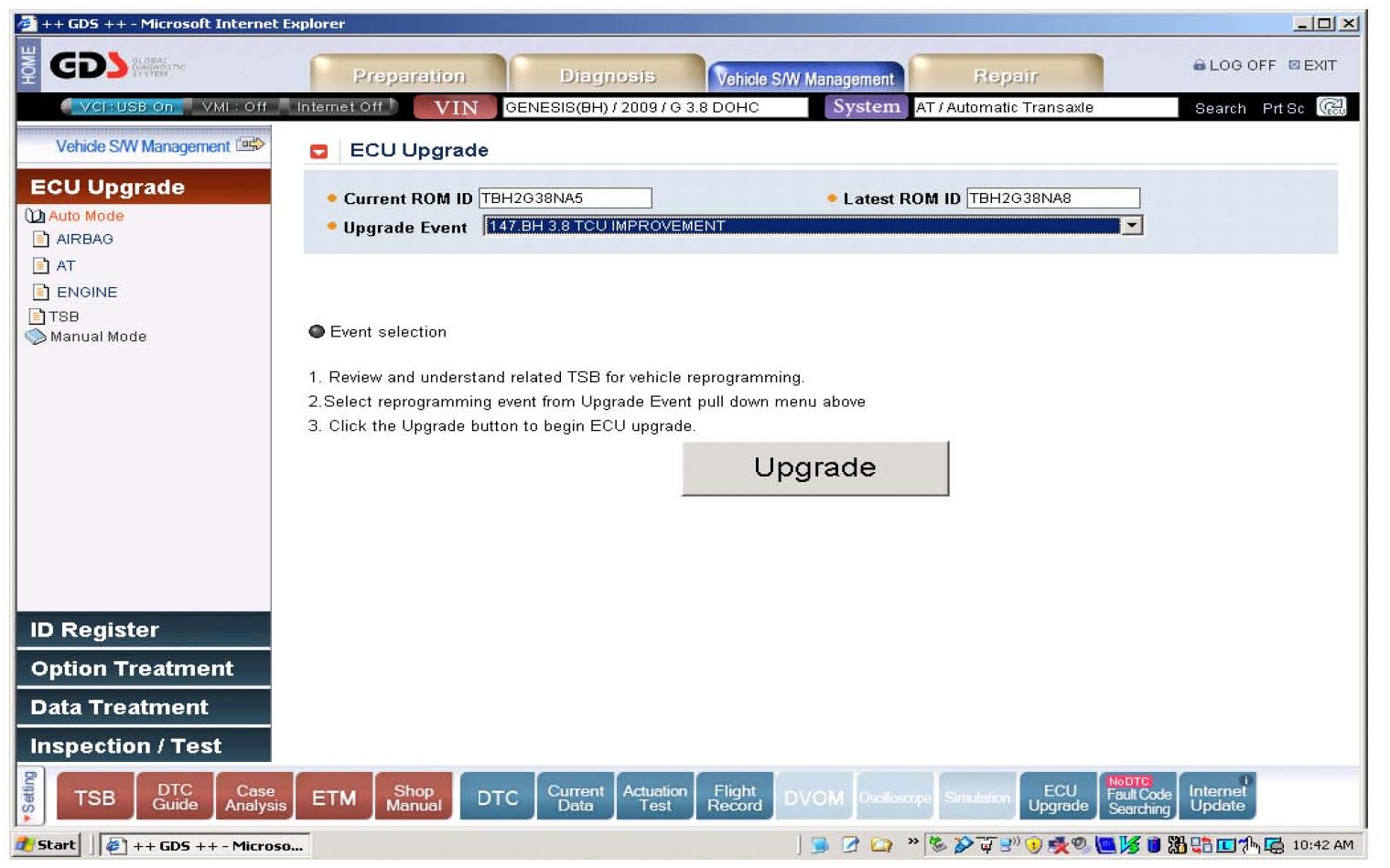 4. After selecting OK, the GDS will read the ROM ID. Select upgrade event 147 BH 3.8 TCU IMPROVEMENT. Select UPGRADE, then OK.