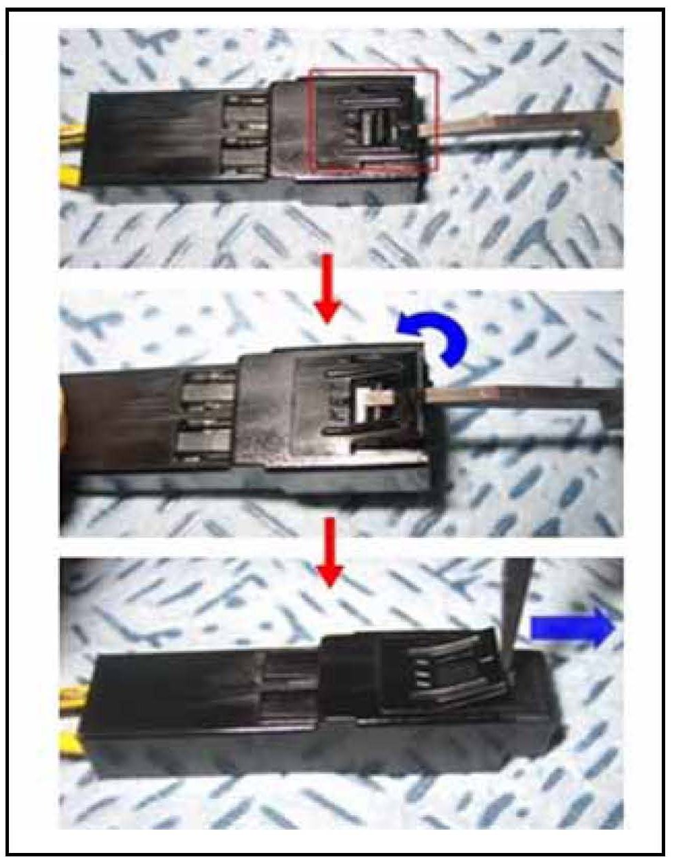 4. In order to remove diode, gently remove the Z01 diode from the diode connector according to the order shown in pictures above. Gently raise the latching clip and pull the connector outwards as shown in the picture.