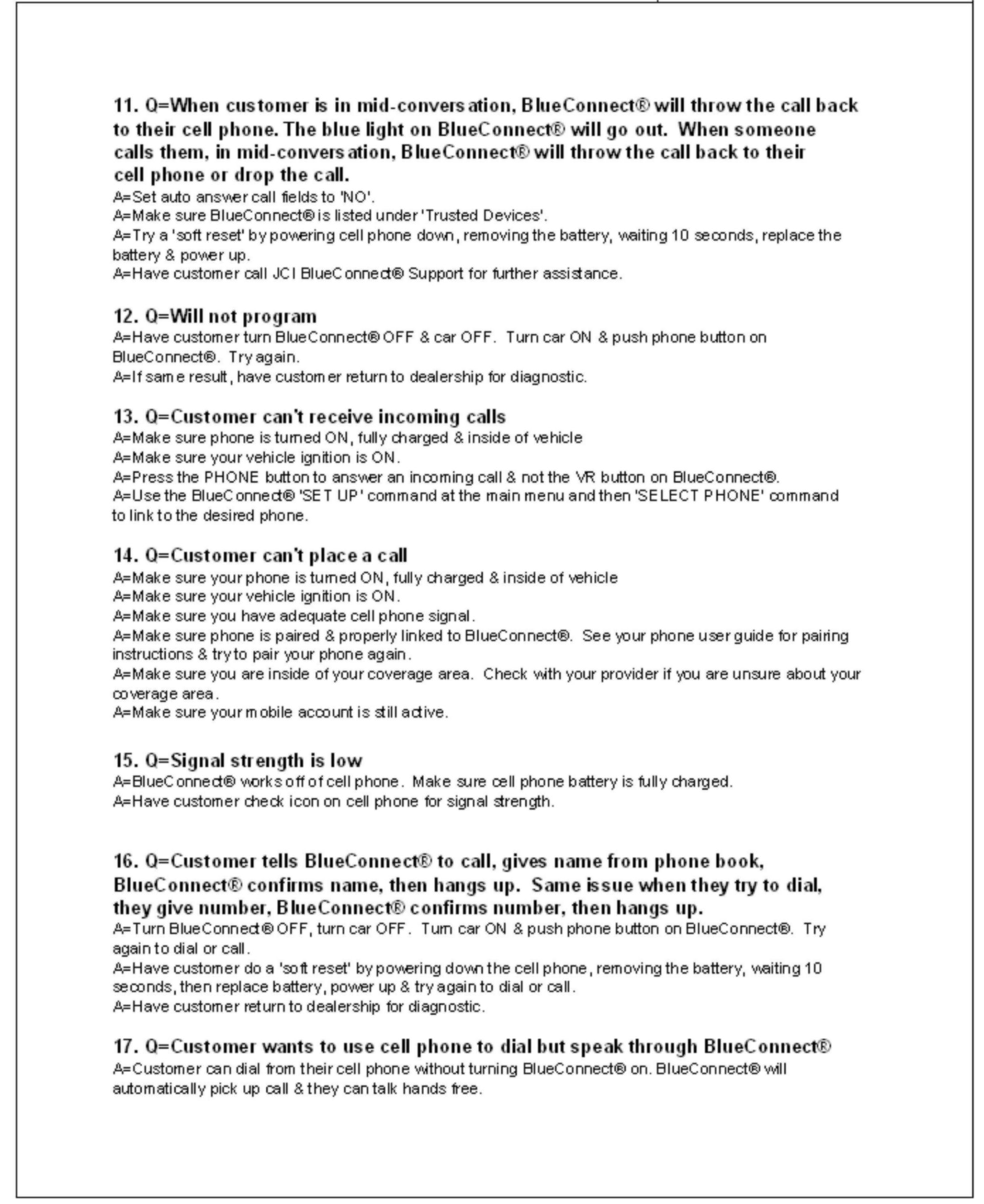 1. Consult the customer and obtain the exact nature of the problem (e.g. completely inoperative, sound quality is poor, etc.) and the make & model of their cellular phone.2. Check phone compatibility at www.jciblueconnect.com or by calling 1-888-528-7930. If the phone is not listed as compatible, advise the customer that their phone is not compatible.
