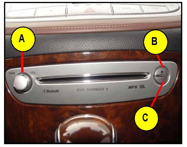 3. Ensure that there are no discs in the changer mechanism by pressing the eject button [B] for 3 seconds. This will eject ALL discs that may be in the mechanism.