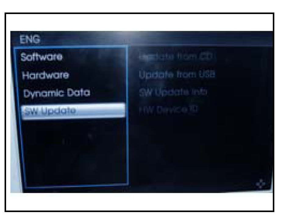 7. Using the CCP, scroll the focus bar down to 'SW Update' on the left side of the display screen, and 'jog' the CCP to the right.