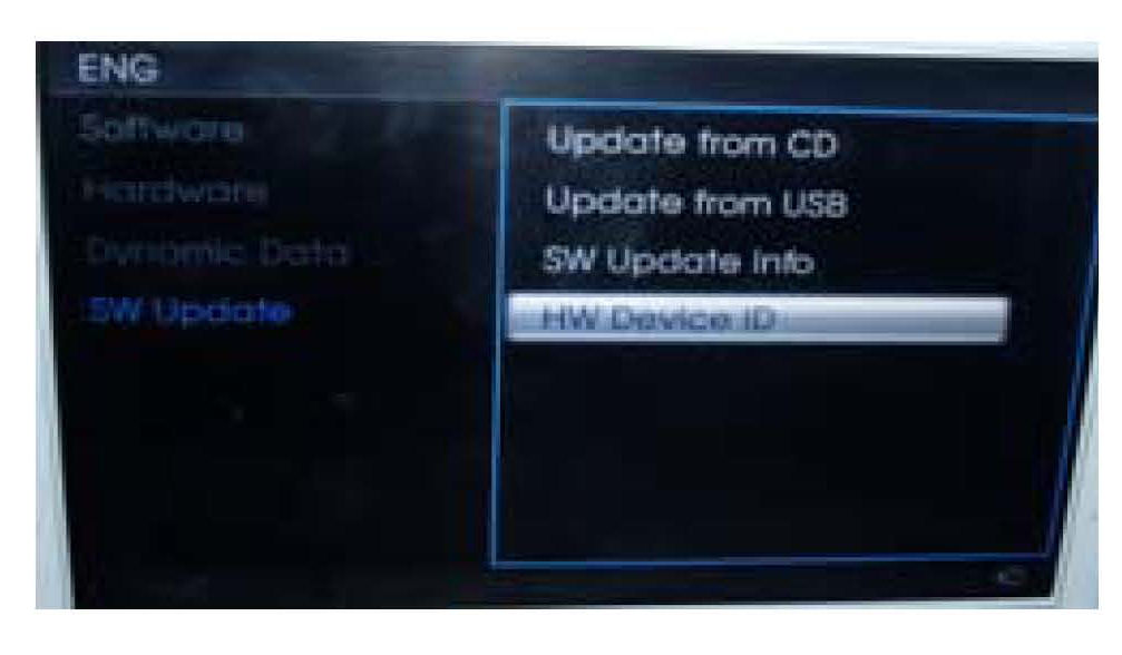 13. Using the CCP, scroll the focus bar down to "SW Update" on the left side of the display screen, and 'jog' the CCP to the right. Select the "HW Device ID" as shown on the screen to the right.