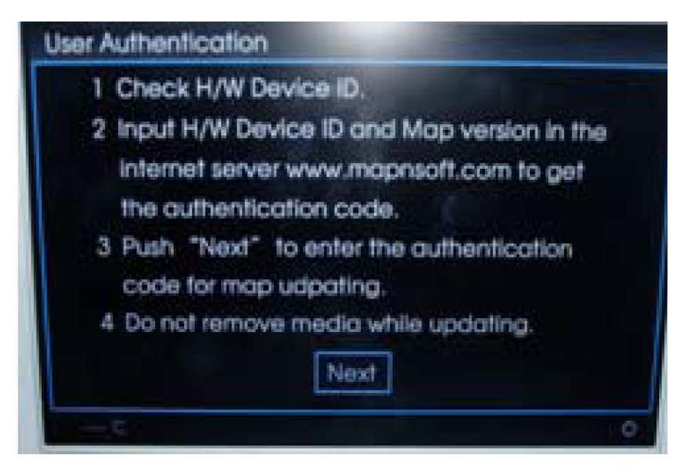 14. The "HW Device ID" will be shown on the screen. Write down this ID number on the Repair Order, then select "OK". This ID number is required to get the "Map Authentication Code from the call- center or call-center website in the next step.
