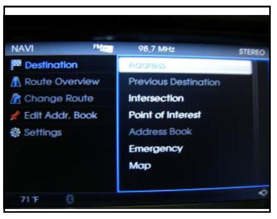 ^ Press the NAVI/MENU button, jog the dial to the right of the screen, and highlight ADDRESS. Press the CCP knob down.