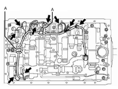 4. Connect the transmission wire to the 2 clamps (A) and the 9 solenoid connectors to the solenoids.