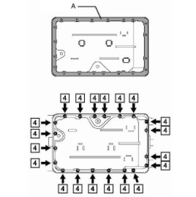 9. Install a new oil pan gasket (A) and the oil pan to the transmission case by tightening the 20 bolts.
