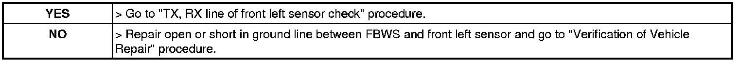 3. Measure resistance of TX, RX line between FBWS unit and front left sensor harness connector.