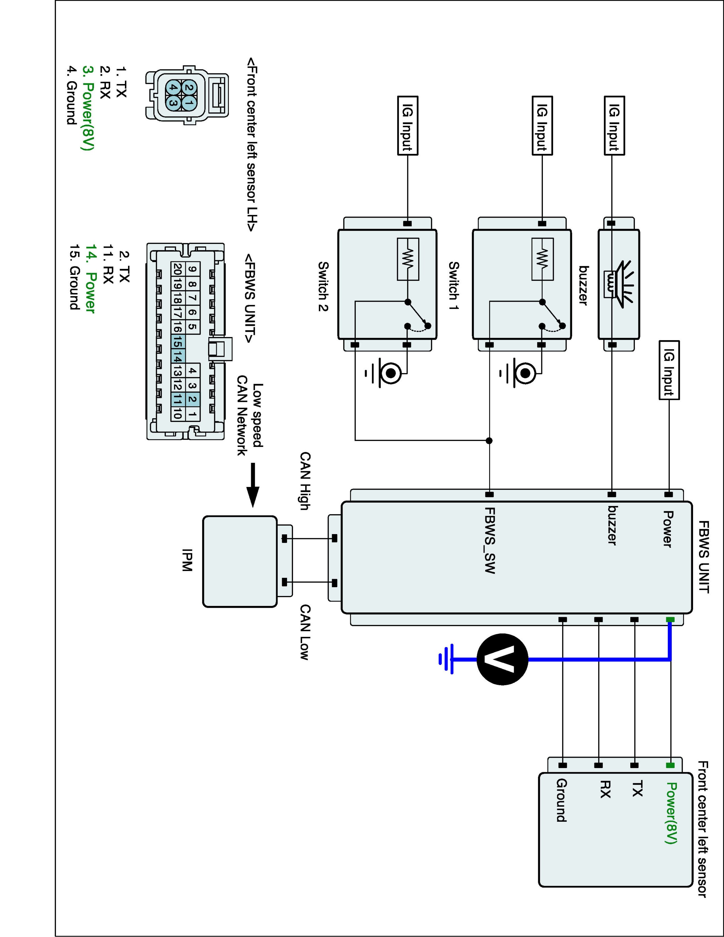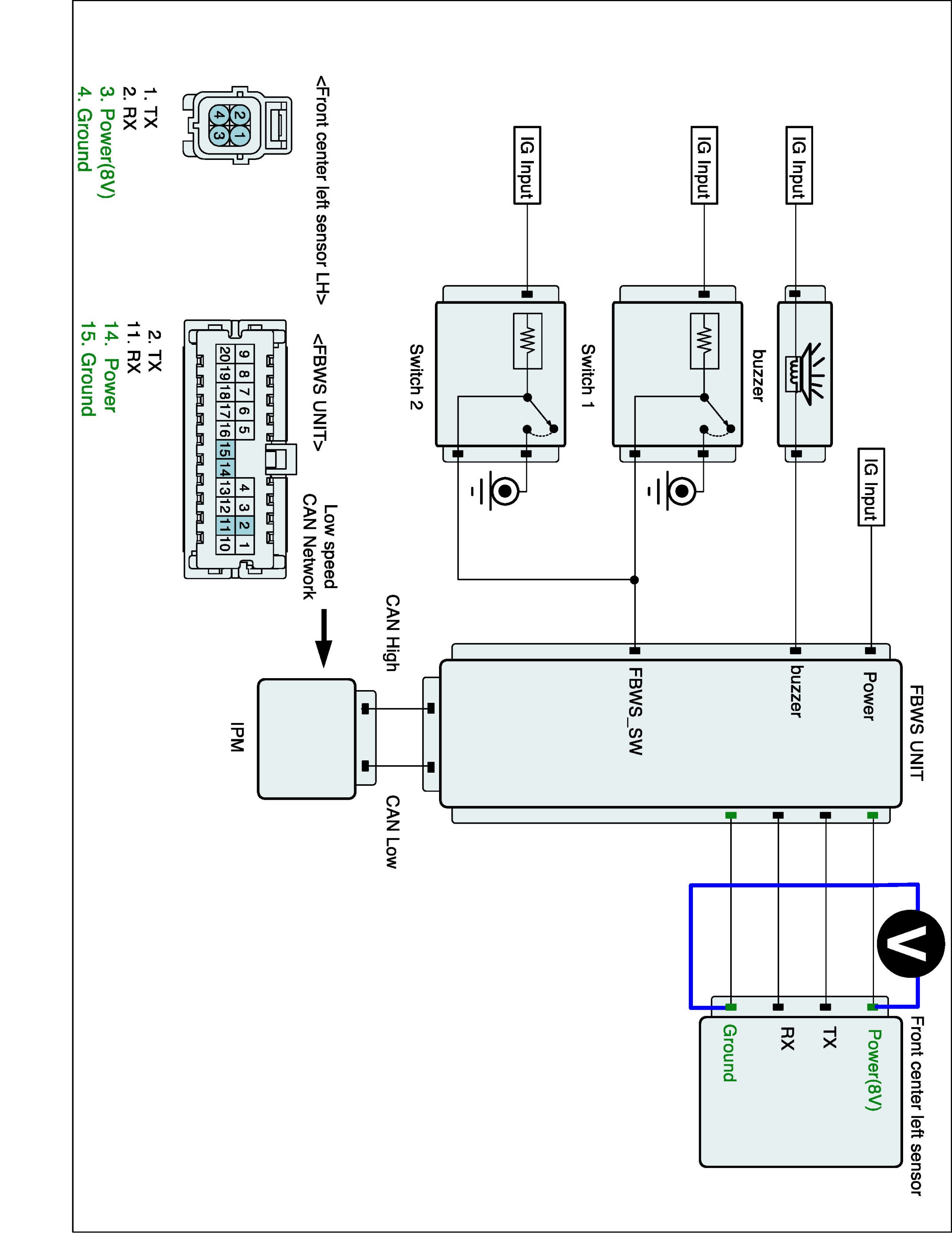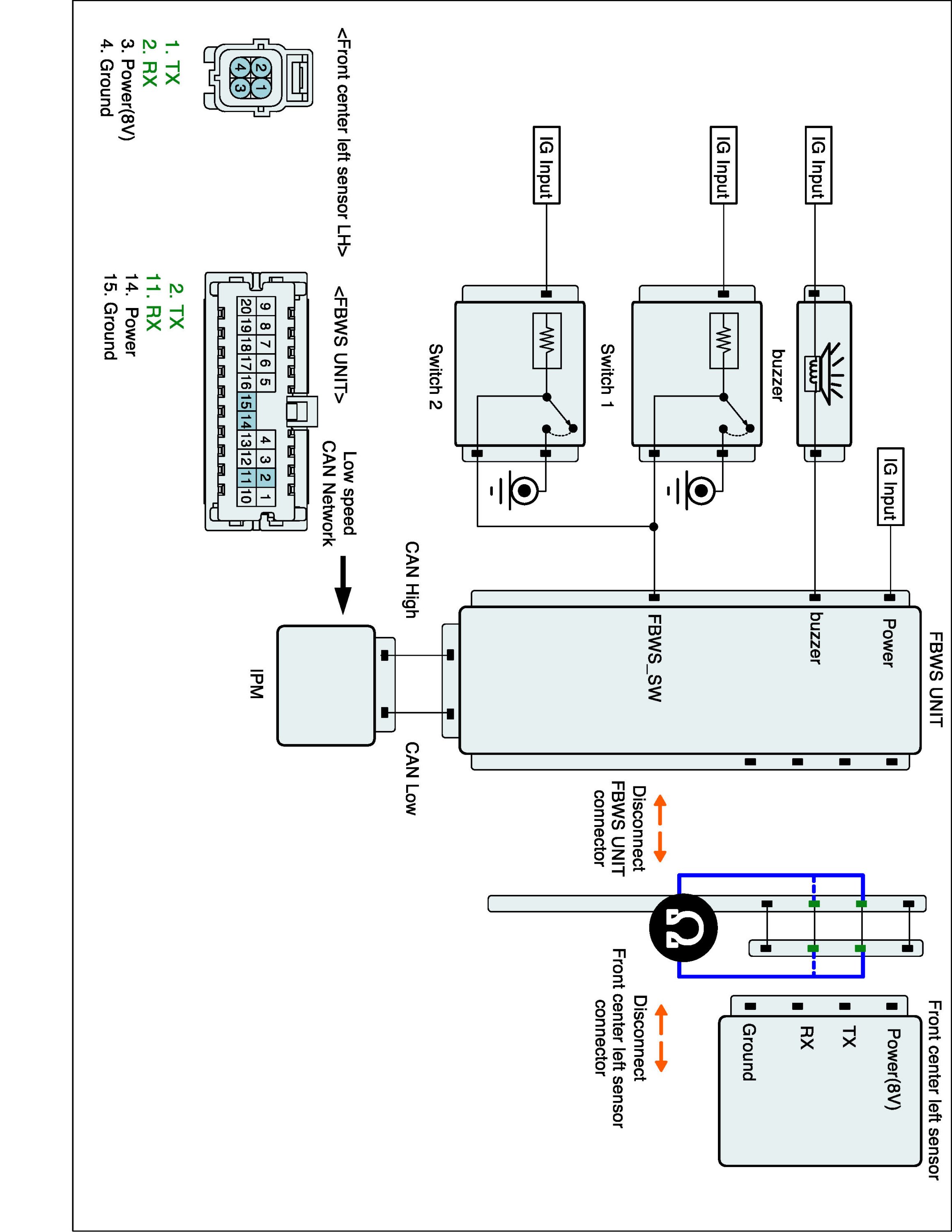 3. Measure resistance of TX, RX line between FBWS unit and front center left sensor harness connector.