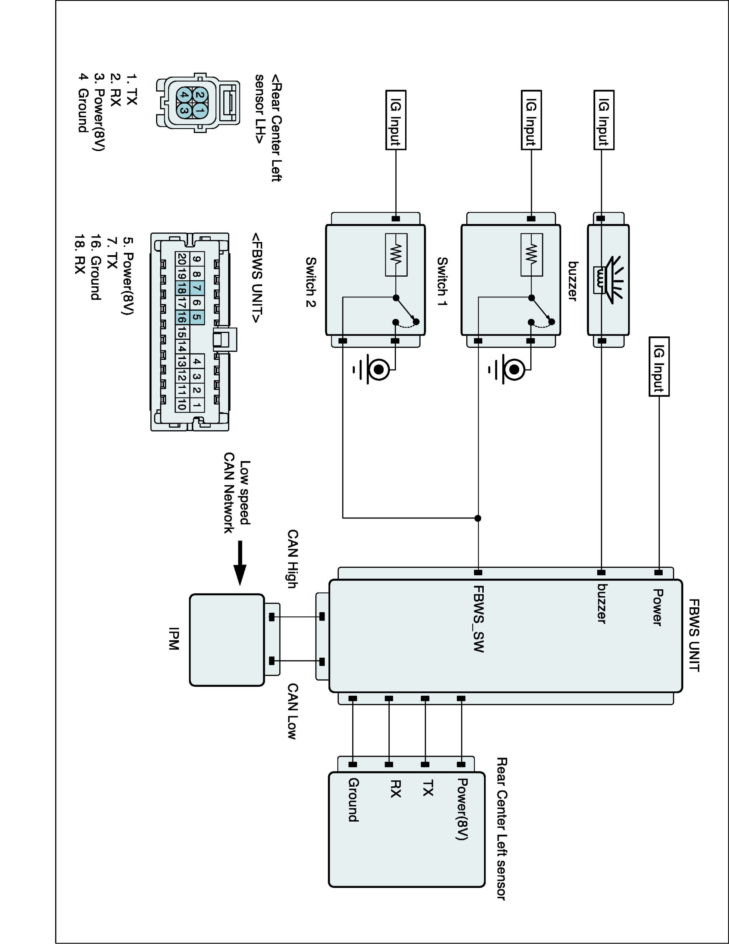 FBWS is a parking assistant system. It has a supersonic sensor which radiates supersonic to front and rear side of the vehicle to detect supersonic reflected from an obstacle. It calculates distances between vehicle and obstacle if it detects reflected supersonic. It warns being obstacle to drivers through buzzer or displaying on cluster according to distance from obstacle. Warning level is divided into 3 step (warning level rises progressively according to distance from obstacle)