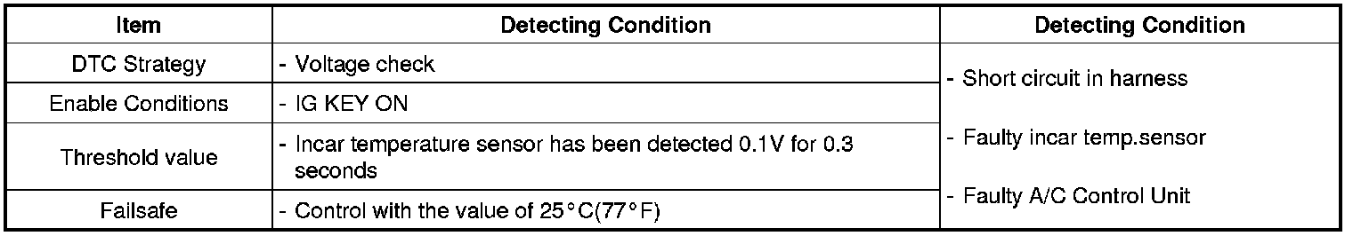 Air conditioner Control Module sets DTC B1233 if Incar temperature sensor has been detected below 0.1V for 0.3 seconds.