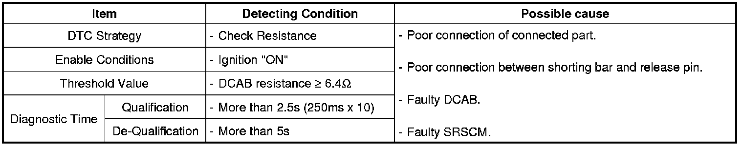 The SRSCM sets DTC B1473 if the measured resistance value of DCAB circuit is more than the threshold value.