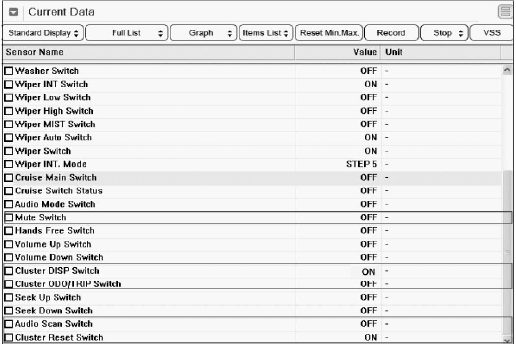 3. Check whether "Audio2 Switch (DISP, TRIP, RESET, SCAN, MUTE, SDS)" is turned to "ON" when the Audio1 switch is pressed.