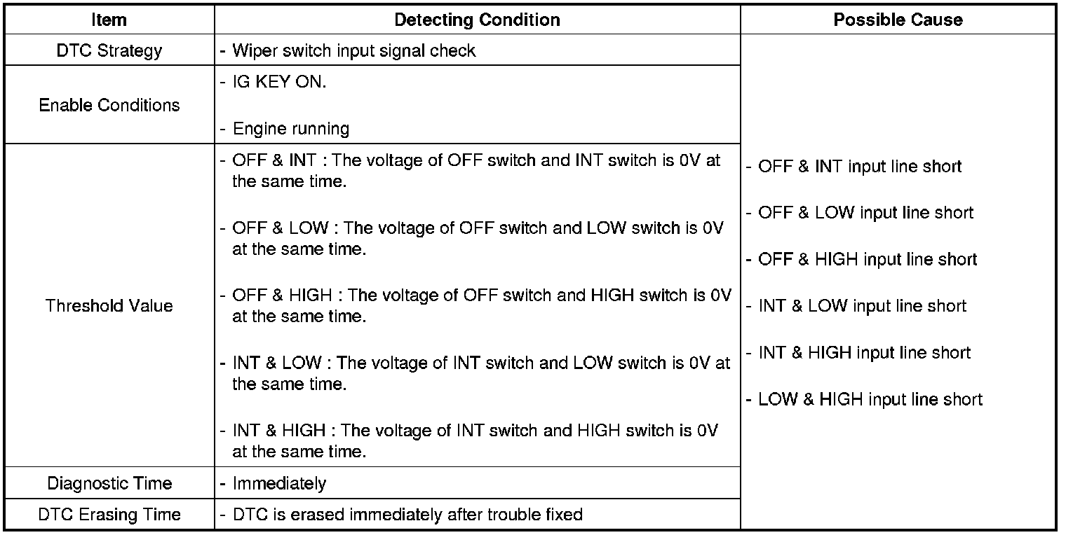This code is outputted when MFSW receives over two signals (OFF & INT, OFF & LOW, OFF & HIGH, INT & LOW, INT & HIGH, LOW & HIGH) of wiper switch at the same time.