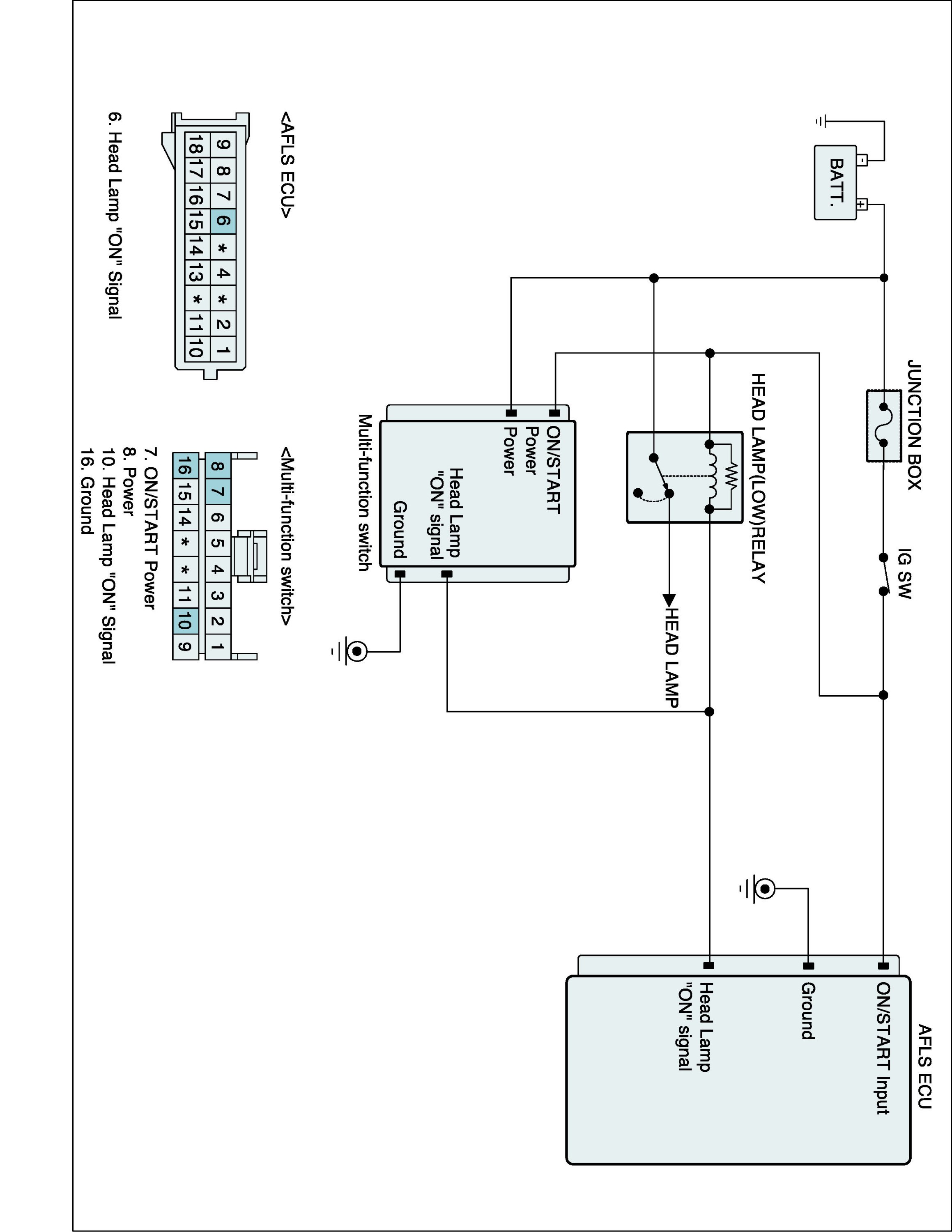 AFLS (Adaptive Front-Lighting System) provides driver with the best visibility by adjusting vertical direction of the headlamp. It consists of AFLS ECU, Leveling Actuator-Intelligent Stepper Motor, Swivel Actuator, Head lamp switch, Height sensor (not applied to ECS). For efficient operation of system, AFLS ECU check Battery voltage.Battery function is supply power to AFLS ECU and Actuators.AFLS ECU detect to headlamp signal that controlled by multi-function switch in order to decide headlamp operation.
