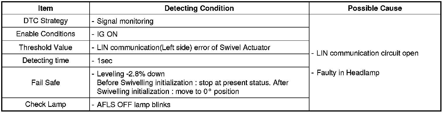 LIN (Local Interconnect Network) is direct communication system to low-cost for electric system of vehicle.height sensor signal, vehicle speed, steering angle sensor signal are input to AFLS ECU to find out of headlamp position and AFLS ECU drive actuators through LIN communication.AFLS (Adaptive Front-Lighting System) drive Leveling Actuator-Intelligent Stepper Motor for adjusting up and down, and Swivel Actuator for adjusting right and left side.